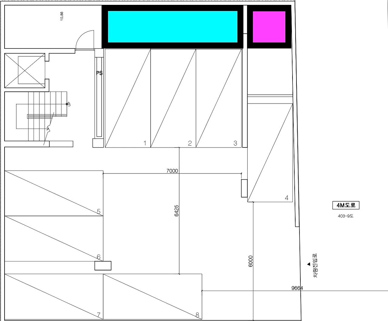 이 거대한 소방 설비 때문에 주차면적이 다소 좁아지는 것은 아주 약간의 편리성을 포기하면 된다. 이 집은 경사지에 위치하고 있어서, 주차장 진입로가 따로 필요 없이 4미터 도로에서 곧바로 주차장으로 진입하는 게 큰 장점이다. 이런 경사진 곳이 아니었다면 나는 지하층에 주차장을 만들 꿈을 꾸지 못했을 것이다. 작은 부지에 집을 지을 때는 주차장 진출입로가 골치거리라는데, 내게는 그런 걱정이 없다. 내가 집터를 주저 없이 이곳으로 정한 중요한 이유 중 하나는 주차장이었다. 게다가 골조공사의 실수로 10 센터 미터 높아진 지하층 바닥의 높이는 도로와 높이를 맞추는 걸 도와서 주차장 진출입을 더 쉽게 만들어 주었다.