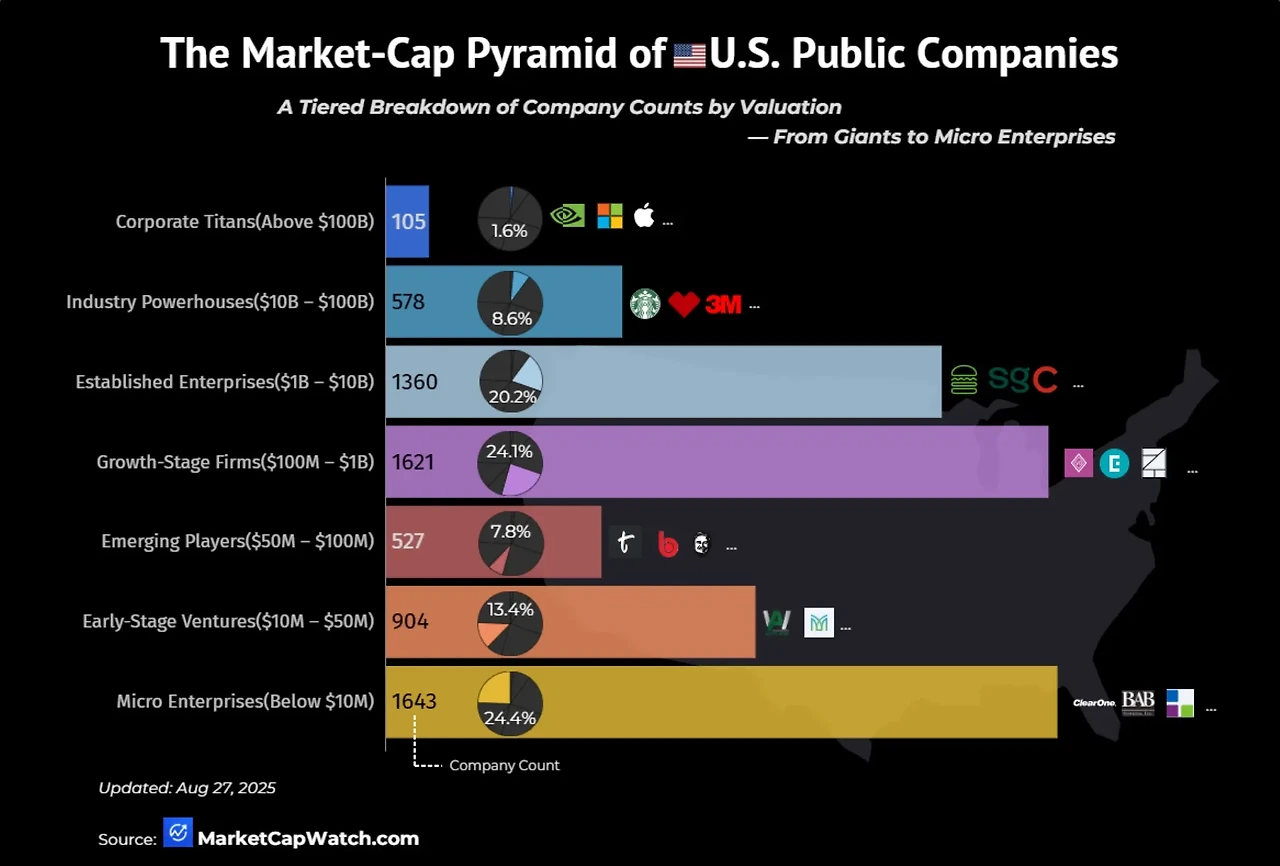 흥미로운 점은 숫자상 압도적 다수인 중소기업들이 투자자들의 관심이나 언론 보도에서는 거의 무시된다는 사실이다. 전체 기업의 98.4%가 1,000억 달러 미만임에도 불구하고, 투자자들의 시선과 자본은 상위 1.6%에 집중된다.