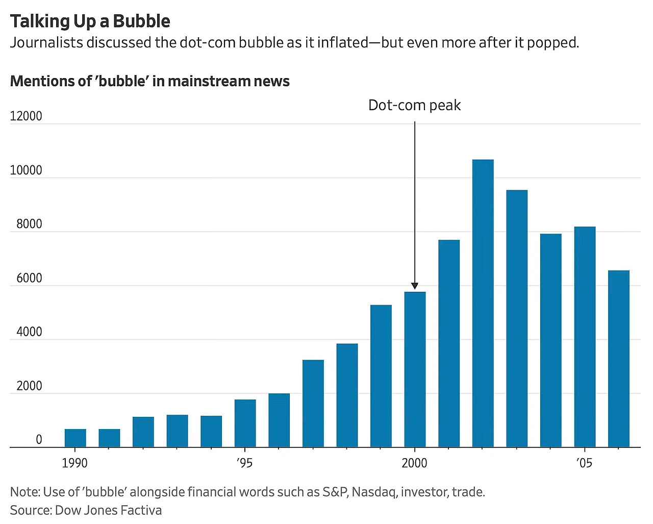 닷컴 버블의 교훈은 명확하다. 2000년 나스닥이 정점을 찍을 때까지 주류 언론의 '버블' 언급은 미미했다. 연간 약 5,500건 수준. 정작 경고가 필요했던 그 시점에 말이다. 하지만 시장이 무너진 2001년, 그 단어는 폭발적으로 늘어나 연간 1만 건을 넘어섰다. 집단적 통찰은 항상 사후에만 작동한다. 손실이 확정된 후에야 우리는 '그때가 버블이었다'고 인정한다.