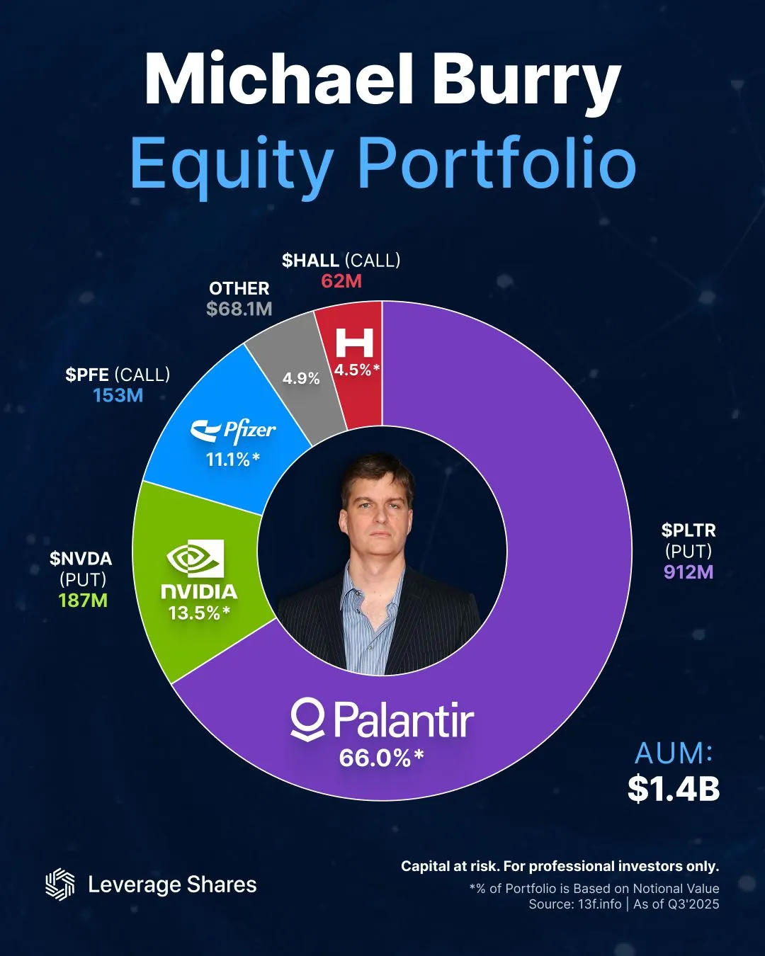 2008년 금융위기를 예측해 전설이 된 마이클 버리(Michael Burry)가 또 다시 시장에 경고음을 울렸다. 그의 최근 13F 공시 자료에 따르면, 14억 달러(약 1조 9,600억 원) 규모의 주식 포트폴리오에서 AI 열풍의 중심에 있는 두 기업, 팔란티어(Palantir)와 엔비디아(NVIDIA)에 대규모 풋옵션을 매수했다.
