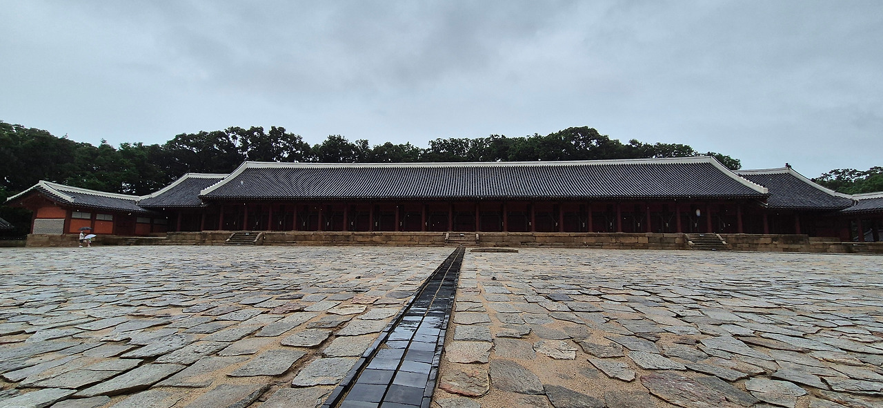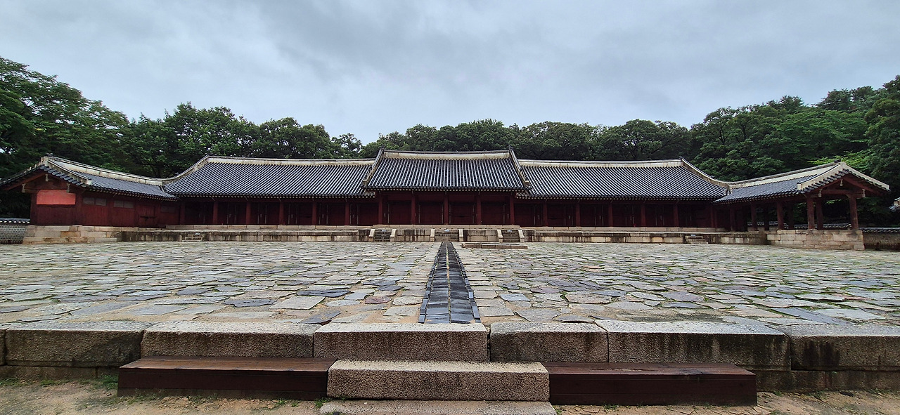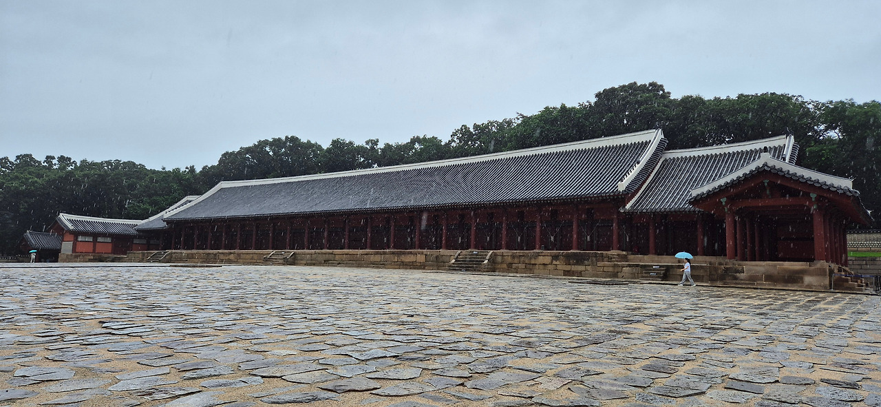 비가 다시 거세어졌다. 내리는 비 속에서 한참을 바라보았다. 월대는 충분히 넓었고, 계단은 정연했으며, 열주를 이룬 기둥은 그 하나하나가 수백 년의 세월을 이고도 남았다. 목재를 감싸는 주칠 빛은 강렬했고, 지붕을 덮은 기와의 검은색은 심연처럼 깊었다. 건물 자체도 굵은 기둥과 경사도 높은 지붕이 어우러져 크고 육중했다. 하지만, 아무리 봐도 위압감이 들지 않는다. 엄중함과 장중함은 충분했고, 마치 종묘제례악을 형상화해 놓은 듯한 운율감도 느낄 수 있었다. 그런데도 아무리 봐도 위압감이 느껴지지 않는다.