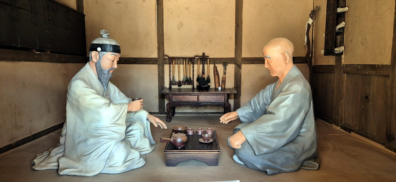 그가 기거했다던 '모거리'를 둘러본다. 방 안에는 그와 마주 앉은 초의선사도 보인다. 세한도의 소나무는 이상적뿐만은 아니었던 것 같다. 이곳에서 그는 풍토병과 싸웠고, 입에 맞지 않는 거친 음식과 싸웠다. 아내에게 보낸 한글 편지에는 "반찬이란 비린내 나는 생선뿐이고... 보리밥은 목 넘김이 어렵다"는 투정까지 보인다. 천하의 추사도 배고픔과 아픔 앞에서는 어쩔 수 없는 노인이기도 했나 보다.