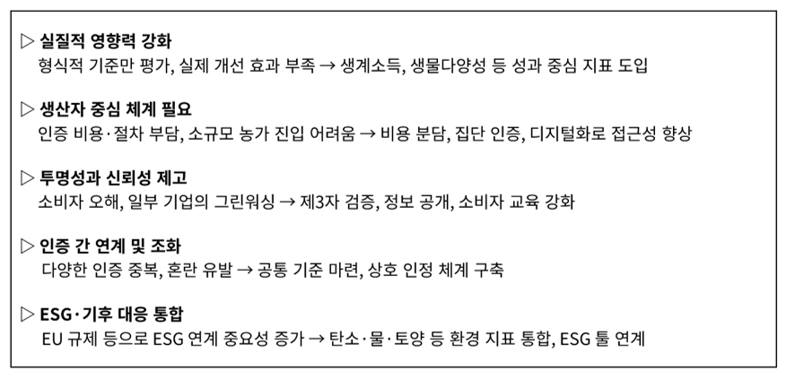 인증 역시 소비자가 신뢰할 수 있는 기준이 된다. 지나치게 복잡한 인증 체계나 소비자와의 소통 부족은 오히려 혼란을 초래할 수 있지만 인증을 효과적으로 활용한다면 소비자의 신뢰를 확보하는 도구가 된다. 인증의 한계와 개선 필요성에 대해서도 다음과 같은 방향으로 활발히 논의가 진행된다.