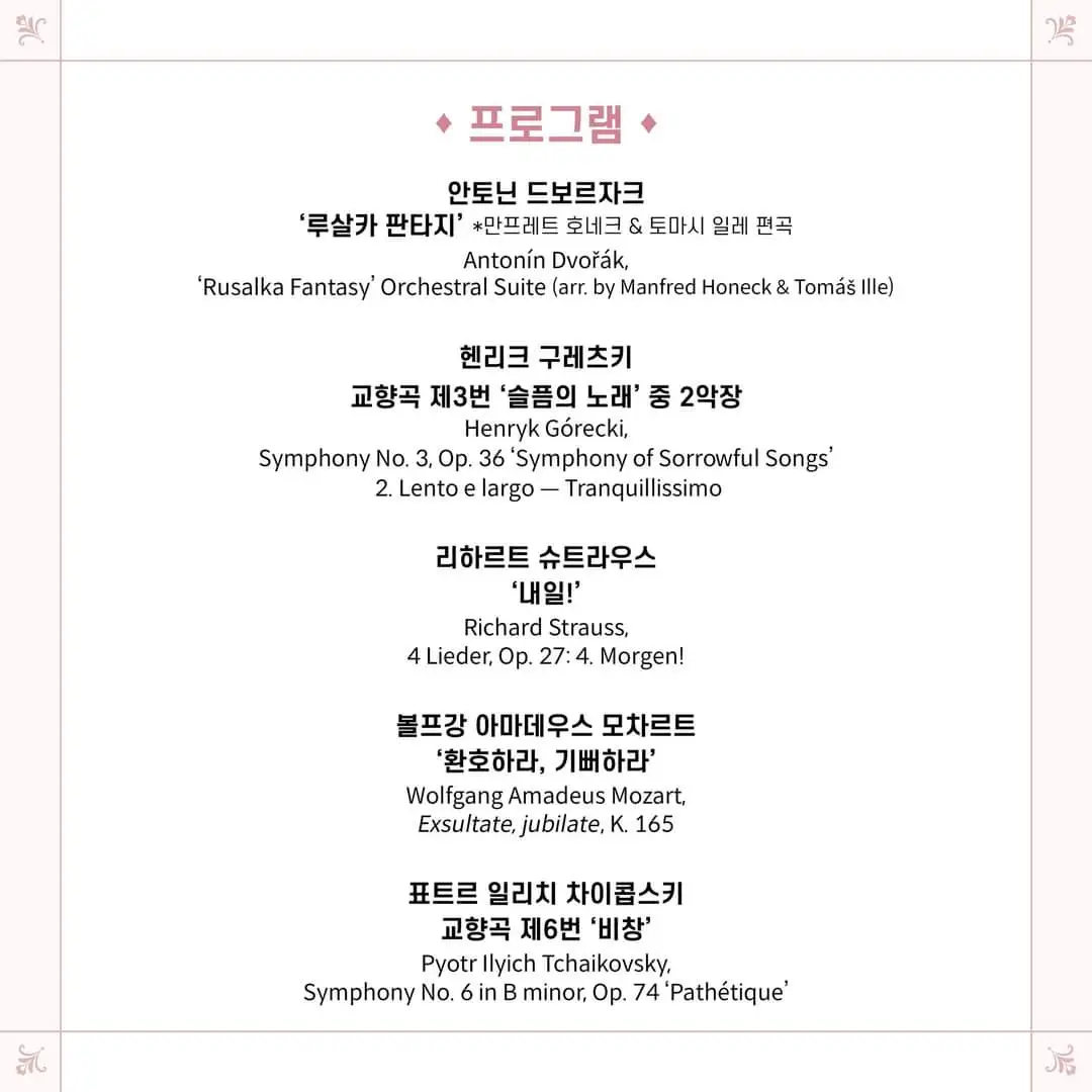 소프라노 임선혜가 협연하는 구레츠키는 전혀 상상해 본 적이 없는 조합이다. 구레츠키를 국내 성악가가 연주한 예는 2017년 4월 27일, 지휘자 구자범과 코리안심포니 (현재 국립심포니) 연주회에서 메조소프라노 김선정이 3악장을 노래했던 순간이 아마도 유일할 것이다. 임선혜 특유의 밝은 하이톤의 목소리가 과연 구레츠키의 작품에 어울리는가 의문이 드는 것도 사실인데 분명히 라디오로 전해지는 사운드는 한계가 있었고 오케스트라와 온전히 융합되는 느낌은 아니었지만 색다른 경험을 선사했다는 점에서는 흥미로웠다. 조용히 사그라지는 마지막 순간의 여운은 훌륭했다.