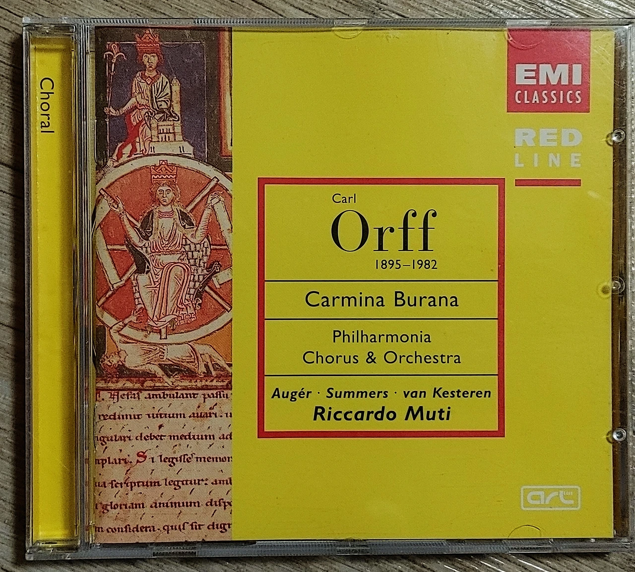리카르도 무티, 필하모니아오케스트라 & 합창단 <카를 오르프 "카르미나 부라나">는 도입부터 최후 종결의 순간까지 무섭게 내지르는 정공법으로 일관한다. 단지 거침없다는 표현만으론 부족하다. 과감한 속공과 적확한 타격, 그리고 장쾌한 폭발력은 어느 한순간도 긴장감을 잃지 않는다. 젊은 시절 무티는 결코 느리지 않았다. 오히려 넘치는 혈기를 주체하지 못해 질주하는 에너자이저였다. 오케스트라가 그의 지휘봉을 감당할 수 없을 것만 같은 속주, 작렬하는 파괴력은 강호의 고수, 무적의 검객, 무티의 진면목을 오롯이 실감하게 만든다. 일부 솔로이스트는 기량적으로 아쉬움이 없지 않지만 전체 완성도는 거의 나무랄 데가 없다. 다른 명반에 비해 깊이가 다소 부족하다는 느낌도 있지만 "카르미나 부라나"가 굳이 무거울 필요는 없다. 오히려 이들처럼 쾌속의 스피드와 시원한 쾌감으로 폭발하는 연주가 더욱 설득력 있다. 운 좋게 실연으로 만나더라도 완성도 높은 연주회를 접하기 쉽지 않은 작품이기에 이토록 깔끔한 연주가 끌리는 것은 매우 당연하다. "카르미나 부라나"는 카를 오르프 최대의 걸작이지만 기능적으로 난해한 부분이 많아 (특히 성악 & 합창 파트) 연주하는데 무척 까다롭다. 그래서 이 음원처럼 거의 기계적인 수준의 연주가 오히려 설득력이 강하다. 분명히 최고는 아니나, 최선의 연주로 단연 최적의 선택이 될 것이다.