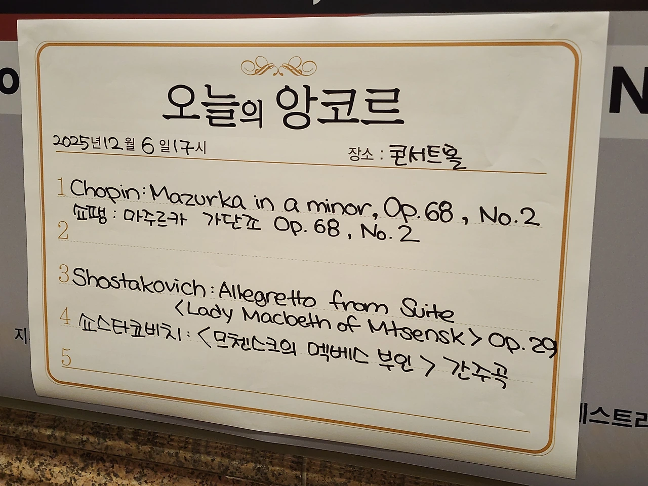 관객들의 박수갈채 속에 커튼콜이 이어지는데 쇼하키모프가 지휘대 위에 돌연 올라선다. 그리고 앙코르 연주가 시작됐다. <쇼스타코비치 오페라 "므첸스크의 맥베스 부인" 간주곡>이 연주되고 무대는 다시 뜨겁게 들끓어 올랐다. 쇼스타코비치 교향곡 이후에 므첸스크를 듣게 될 줄은 상상도 하지 못했다. 탁월한 선곡이었고 지휘자 아지즈 쇼하키모프의 남다른 끼를 확고히 각인시킨 순간이기도 했다.