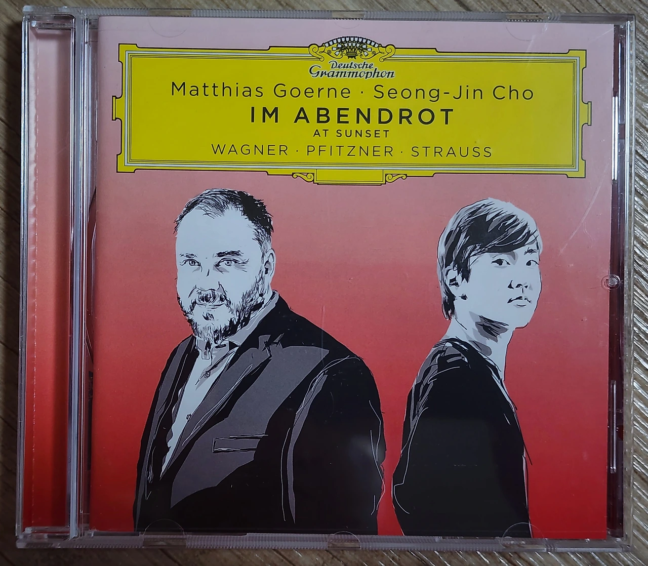바리톤 마티아스 괴르네, 조성진의 '독일 가곡' 음반은 괴르네 특위의 중후한 미성뿐만 아니라 반주자로서의 조성진을 엿볼 수 있는 소중한 음원이다. "Im Abendrot"은 <R. 슈트라우스 네 개의 마지막 노래> 중 마지막 네 번째 곡, "저녁노을"이다. 일몰을 연상케 하는 진분홍빛의 재킷과 두 사람의 묘사화가 이 음반의 분위기를 말해주고 있다.
