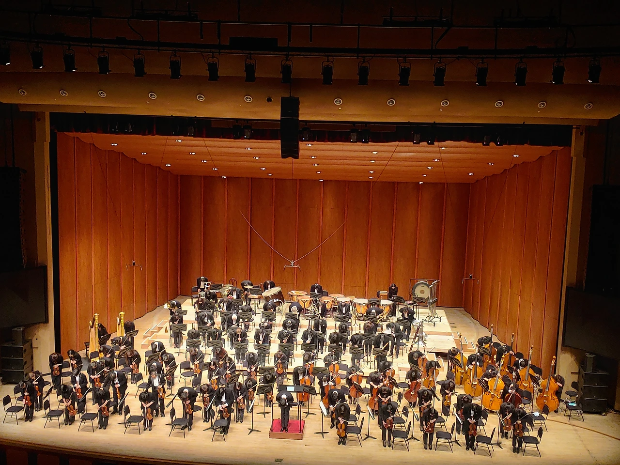 오늘은 전반부 연주곡이 없어 3악장 시작 전 중간 입장이 있었는지 휴지부에 튜닝을 하며 잠시 쉬어가는 타이밍을 가졌다. 날카로운 금관 팡파르로 시작되는 빠른 3악장은 후반부의 폭발적인 총주부가 시작되는 시점에 등장하는 팀파니의 첫 강타가 성급했던 것과 혼 파트의 음 이탈이 있었던 것 등을 제외하면 대체적으로 탄탄하고 진취적인 앙상블로 일관했다. 무엇보다 오늘 공연, 트럼펫 수석이 보여준 빛나는 대활약을 결코 빼놓을 수 없다. 시종일관 또렷하고 강력한 추진력을 발휘했던 그의 연주는 어쩌면 단원들 전체의 멱살을 쥐고 일으켜 세우는 역할을 하는 듯했다. 혼과 트럼본 파트 역시 오늘 공연을 역동적으로 이끈 훌륭한 주역들이다. 큰 실수나 사고 없이 유려하게 앙상블을 견인한 그들에게 진심으로 고마움을 전한다.