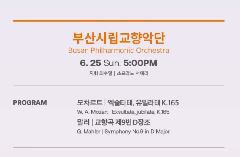 소프라노 서예리는 엠마 커크비를 연상케 하는 목소리를 지녔다. 그녀의 소리는 성량이 크거나 부피감이 있지는 않지만 섬세하고 고혹적인 소릿결은 모차르트나 바로크 음악에 적합하다. 전반부에 연주된 <모차르트 "엑슐타테 유빌라테">는 맑고 단아한 목소리의 서예리에겐 딱 맞는 선곡이었다. 명징하고 강인한 소릿결은 아니지만 그녀는 자신이 지닌 극명한 장점을 가장 곱고 아름다운 형태로 극대화하여 드러낼 수 있는 소프라노였으며 모차르트에 어울리는 그녀만의 해석과 부산시향의 감각적인 반주로 유려하고 맑은 앙상블을 만들어냈다. 오랜만에 실연으로 들어보는 모차르트 음악의 진수였다.