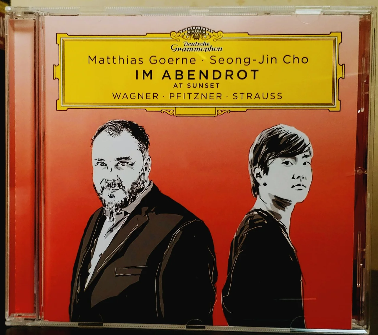 바리톤 마티아스 괴르네와 조성진의 "독일 가곡" 음반은 괴르네의 중후한 미성뿐만 아니라 반주자로서 조성진을 엿볼 수 있는 흥미로운 음원이다. "Im Abendrot"은 <R. 슈트라우스 네 개의 마지막 노래> 중 마지막 네 번째 곡, "저녁노을"이다. 일몰을 연상케 하는 진분홍빛의 재킷과 두 사람의 묘사화가 이 음반의 분위기를 말해주고 있다.