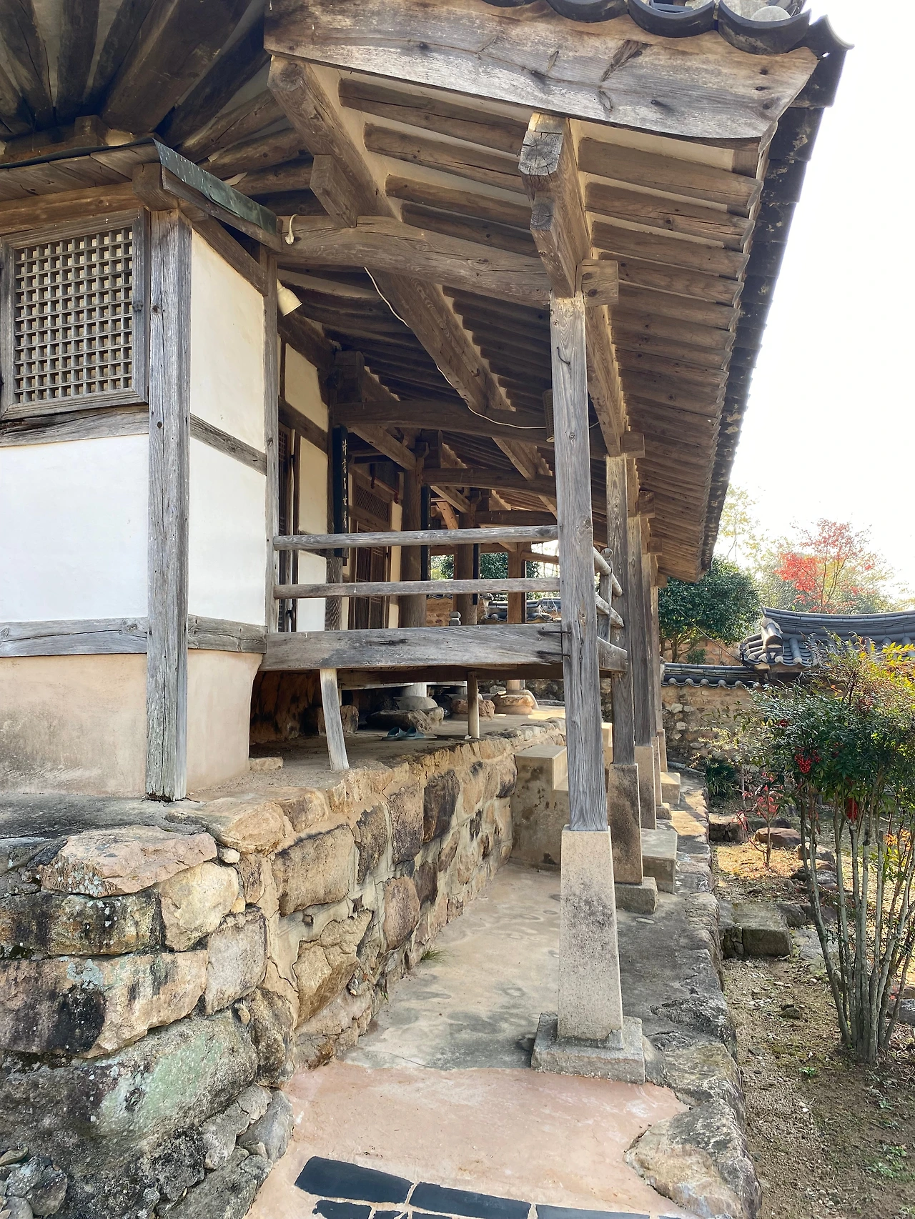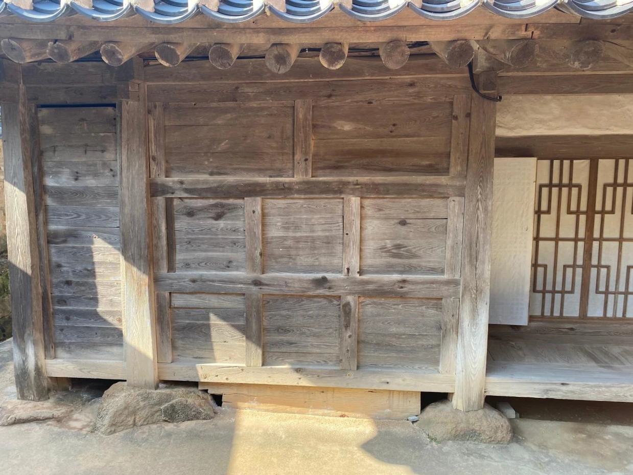 사랑채 뒤로 진입하면 툇마루와 함께 왼쪽 판벽이 눈에 띈다. 상중하 인방을 가로지르고 사잇 기둥 한두개씩을 받친 다음 판재를 뉘워 끼웠다. 왼쪽 두 기둥 사이에는 판재 13장을 차곡차곡 쌓듯이 끼웠는데 이를 빈지널 판벽이라 한다. 답사 당시 집주인께서 판재를 위에서부터 뺐다가 다시 끼우는 방식이라고 하셨다. 맞다. 어릴적 우리 동네에도 있었다. 과거 대규모 농사를 짓던 부농가의 곡식창고 같은데 사용됐었다. 어떤 집에는 널판에 순서대로 번호를 적어두기도 한다. 뺐다가 다시 끼울 때 순서가 바뀌면 틈이 생기고 잘 안 맞게 된다. 빈지널 방식의 판벽은 곡식을 채웠다가 위에서 덜어 꺼내 쓰기 편리하다.