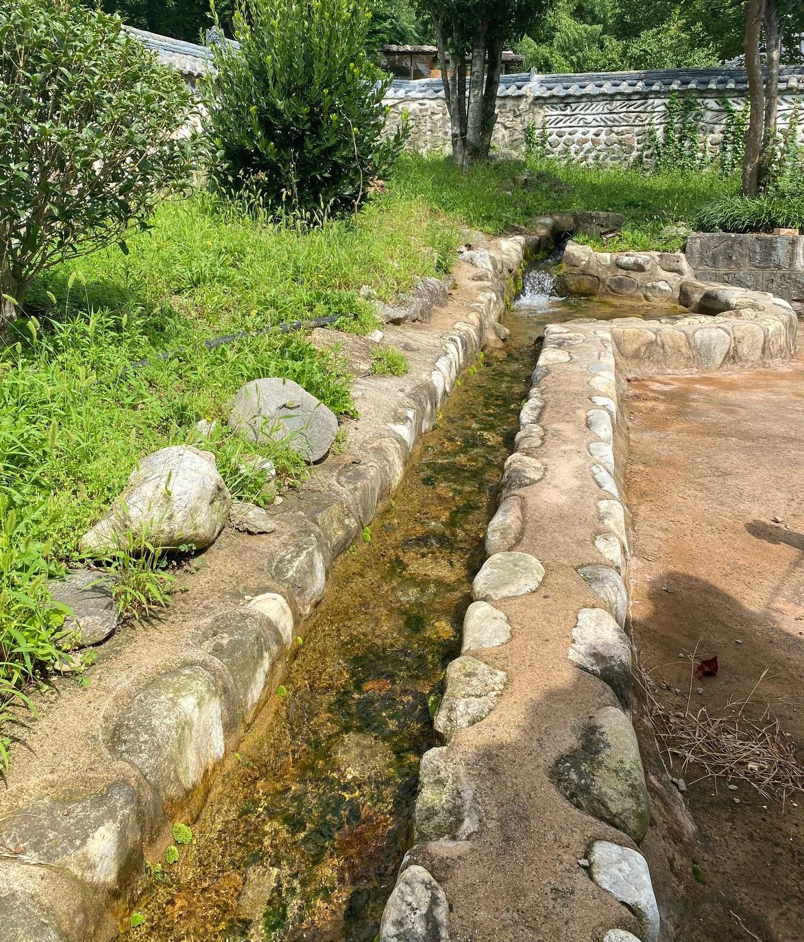 산자락을 끼고 자리 잡은 집들은 산에서 내려오는 물을 바로 사용하는 이점이 있다. 우물을 파는 것보다 편하고, 산이 크고 골짜기가 깊으면 가뭄에도 유리하다. 정 씨 고택은 집 주위 계곡물을 마당으로 끌어들여 생활용수로 사용했다. 그리고 다시 두 갈래로 나눠 한쪽을 사랑채로 내려보내 연못을 가꿨고, 다른 한 줄기는 담장 밑을 통과해 행랑채 측면 담장을 따라 흘러서 다시 집 밖으로 나가게 했다. 덕분에 안채, 사랑채, 행랑채 세 권역 모두 항상 물이 흐르게 됐다. 행랑채가 있는 바깥마당에서는 농기구 정돈이나 소나 말을 돌보는데 필요한 생활용수로 편리했을 것이다.