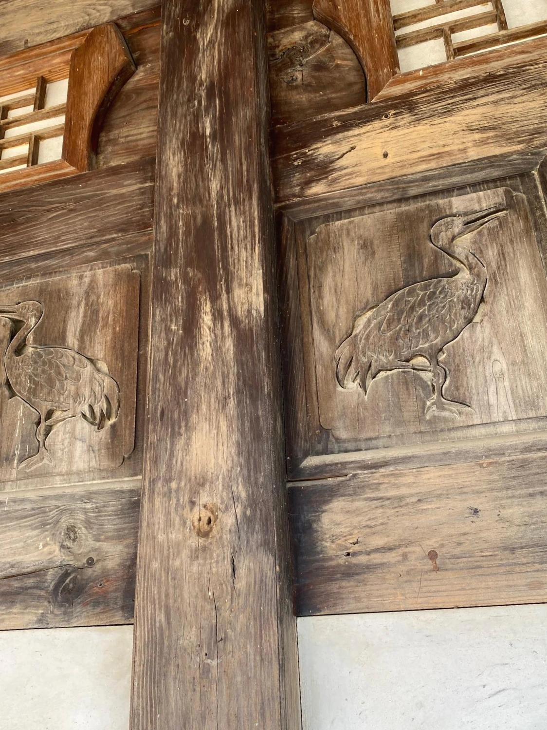안채 문틀 위 기둥 옆에 끼운 조각 장식 판재는 굴뚝 꼭대기 학 장식만큼이나 감탄스럽다.
