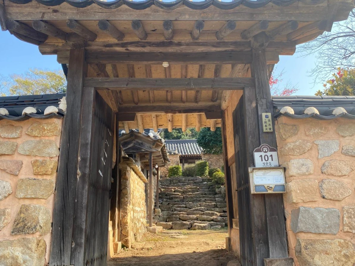 보통 사주문을 평지에 만들 때는 앞 기둥 두 개를 담장 밖으로 돌출시켜 세우고 담장을 대문채 측면 중앙에서 이어간다. 이렇게 하면 전후 기둥 중앙에 문짝이 달리게 된다. 이 집은 언덕 경사지에 자리 잡아 사주문 바깥 기둥 열에 담장 선을 맞춰 안정감을 얻었다. 문짝도 대문채의 측면 중앙이 아닌 사주문 바깥 기둥 열에 달았다.
