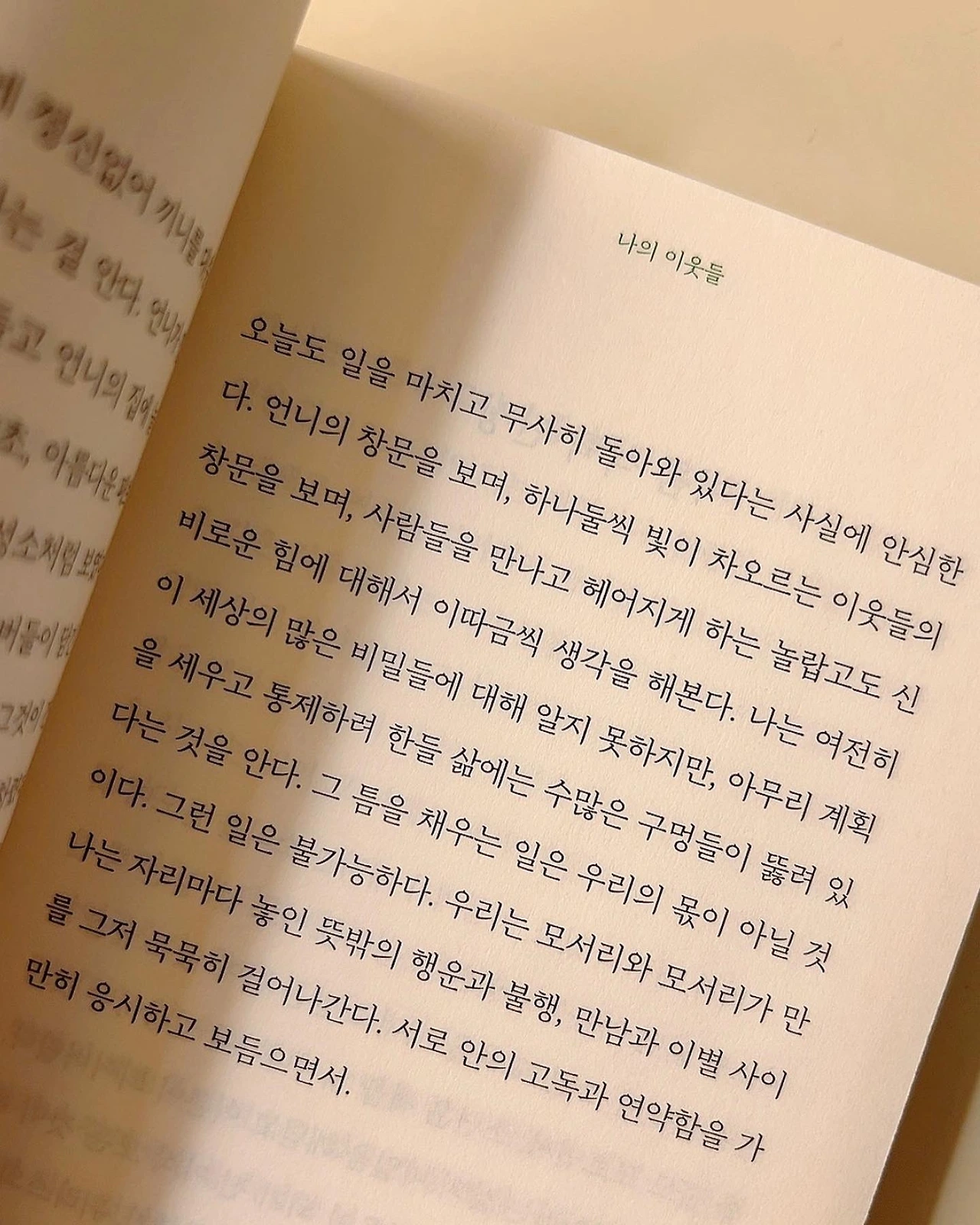의외로 책 선물은 잘 안 하는 편이다. 내가 좋다고 남도 좋을 것 같진 않아서. 이 책 덕분에 책선물 받는 게 이렇게 좋은 일이었어, 새삼 생각했다. 한참을 빠져 읽다 보면 얼굴 한 번 본 적 없는 저자와 혼자 친해진 기분이다. 이해하고 이해받는 느낌이랄까. 저자의 마음, 읽고 좋아서 내게 건넸을 사람의 마음, 그리고 내 마음까지 보태 곱절로 좋았던 책이다.