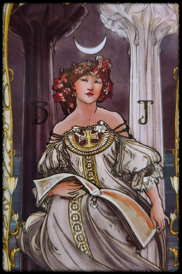 여교황 카드가 갖는 일반적인 키워드는, '내면의 지혜', '무의식', '신성한 비밀', 그리고 '직관'이라고 보통 알려져 있다. 무하 카드에서의 여교황은, 검은색과 흰색의 두 기둥 사이에서 어두운 뒷배경을 바탕으로 오묘한 시선 끝에 우리를 바라보고 있다. 입은 굳게 다물어 있지만, 두 눈에서 마치 '네 생각을 먼저 말해 보라'라는 듯한 질문을 던지는 듯 무릎을 꿇고 고해성사를 해야 할 것만 같은 분위기로 압도하곤 한다.
