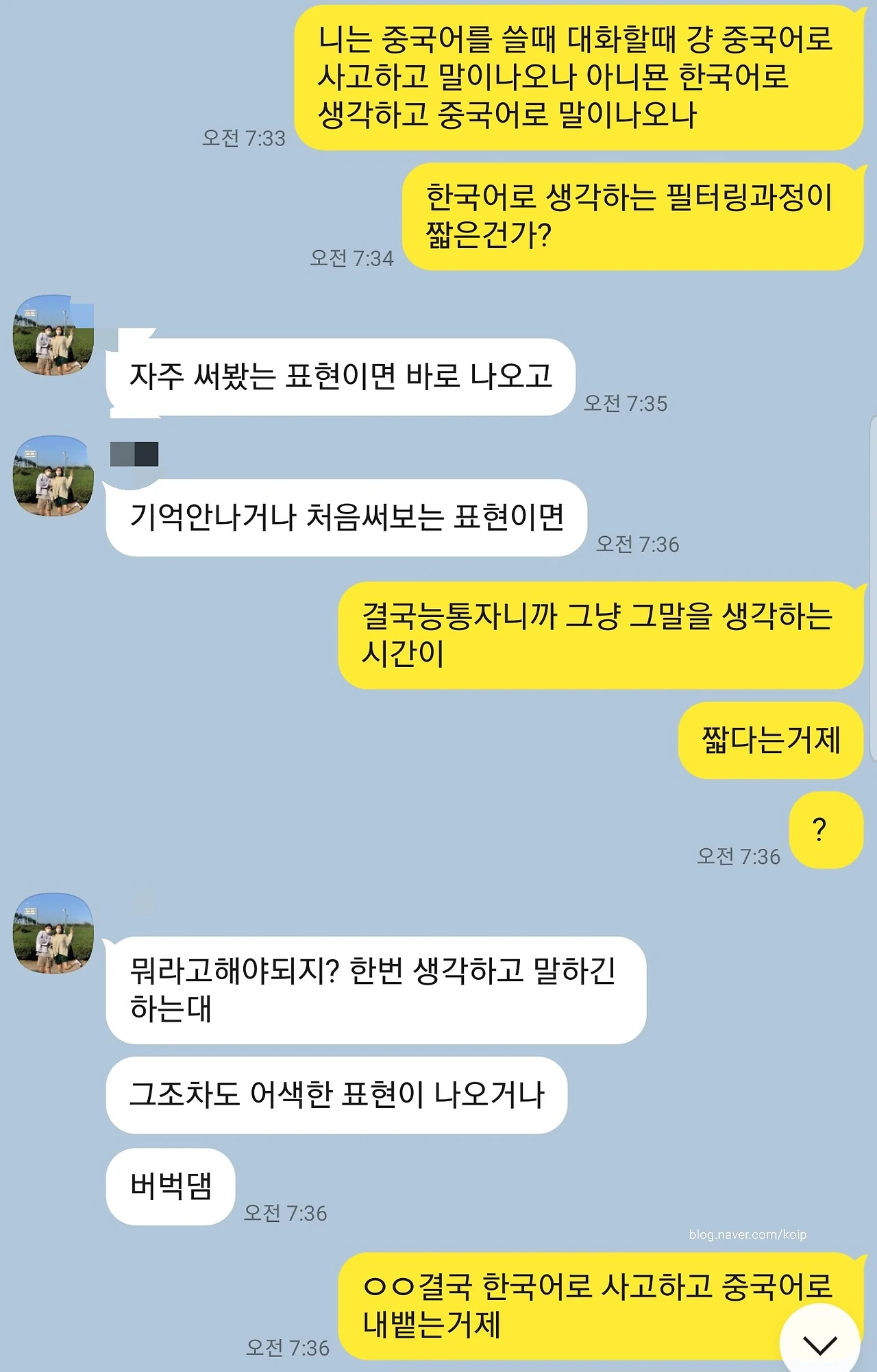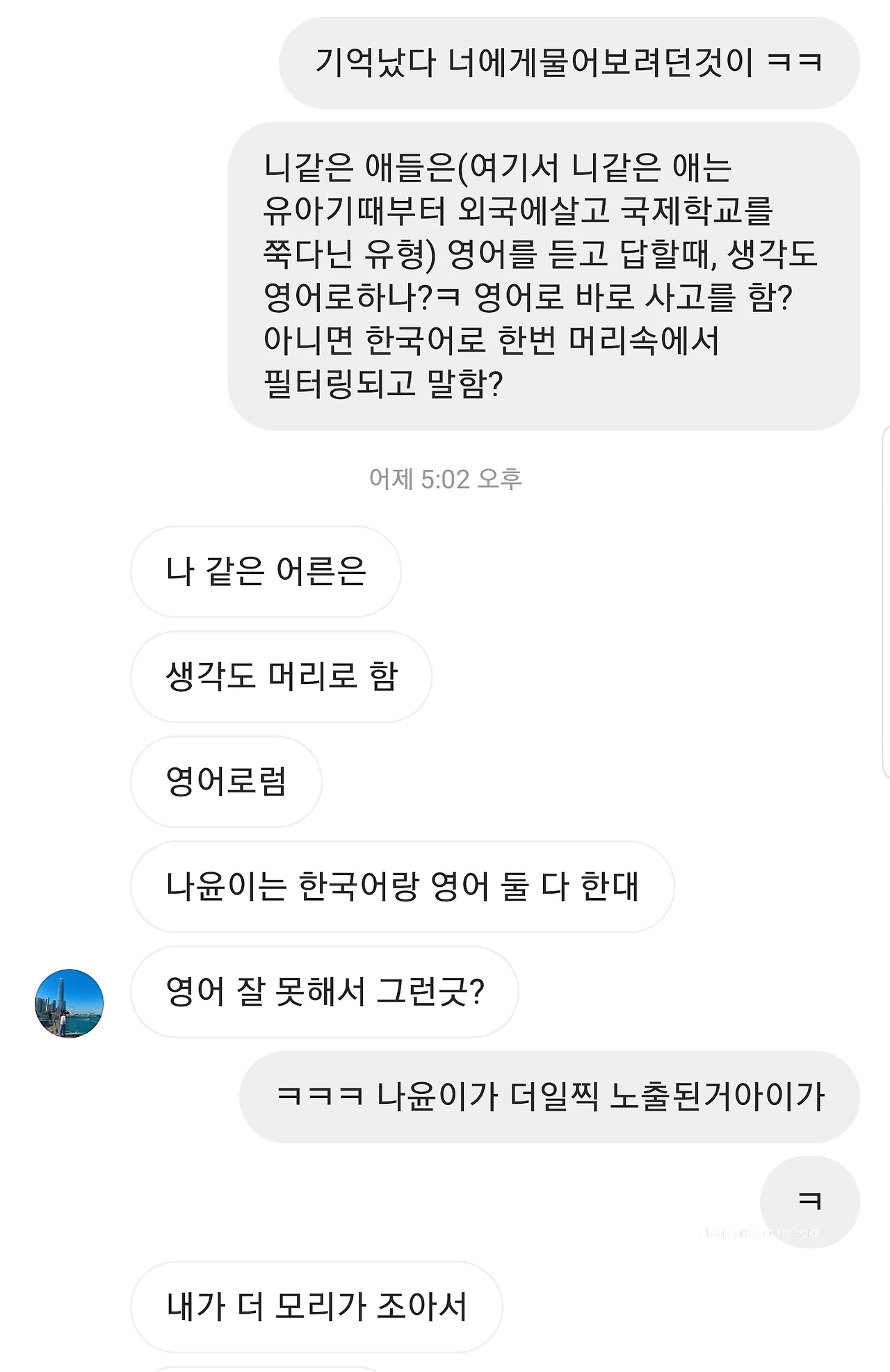 중국어는 아주 유창하게 하고, 영어는 적당히 하는 정도인 아이에게 말도 안 되는 질문이지만 (영어보다 중국어 능통자임) 중국어로 사고하고 이야기하냐 했더니 아니란다.