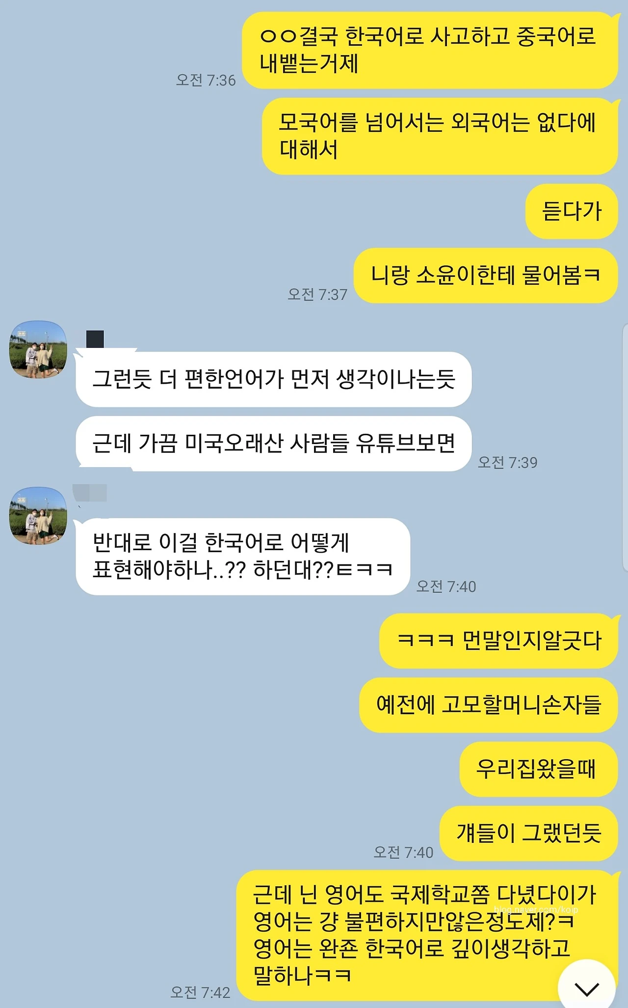 얘네들은 자매인데 2살(10개월), 4살부터 외국에 살기 시작했다. 4살이던 첫째 아이가 9살 때 한국에 들어와서, 초등학교를 한 4~5년쯤 다니다가 다시 외국에서 중등, 고등을 보낸 것 같다. 지금 20살, 22살이 되었고 현재는 홍콩에서 유학 중이다. 인생에 반이상을 외국에서 보냈고, 국제학교를 쭉 다닌 이아이들은... 영어로 말할 때 딱히 한번 필터링하지 않는다고 했다.