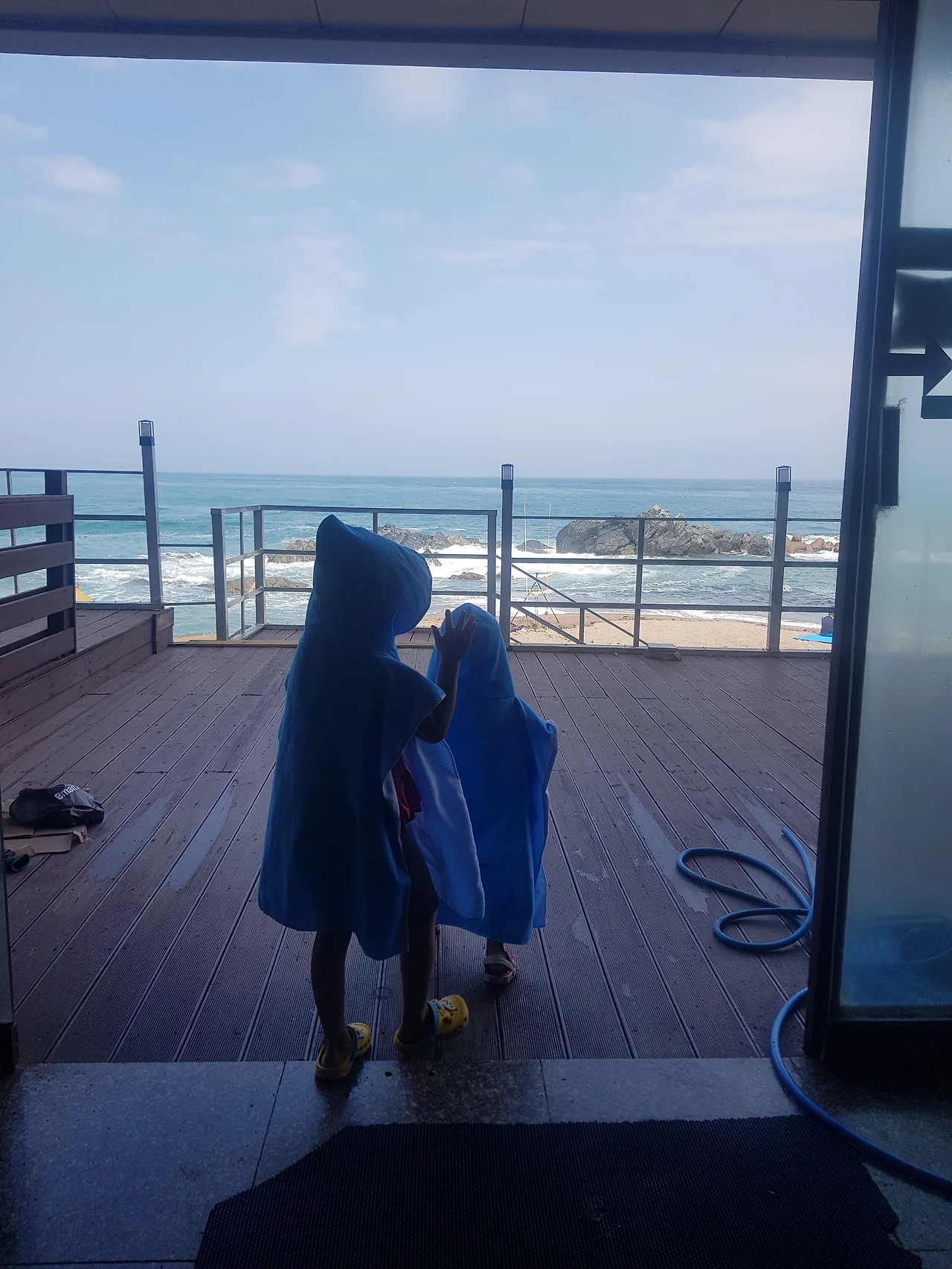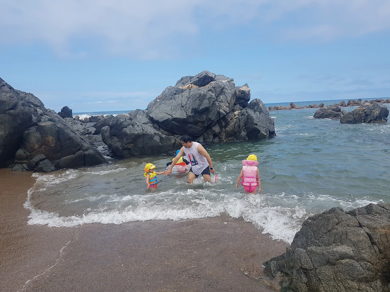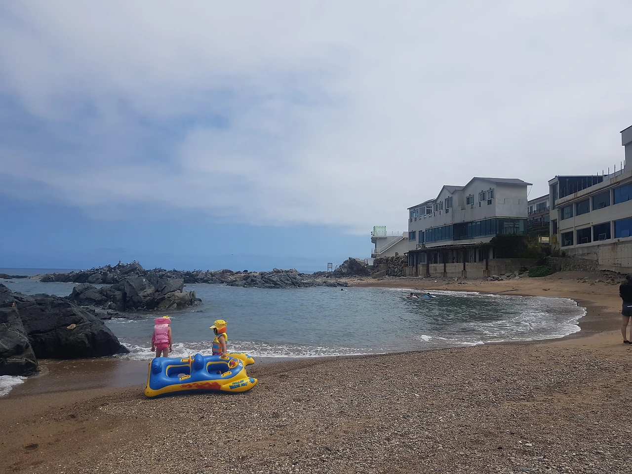 숙소는 영덕의 작은 해변에 위치한 세련되진 않았지만, 내 기준에 적합했던 해변 라인(물놀이할 때 아이들이 차도를 건너지 않아도 되는 곳)이었다.