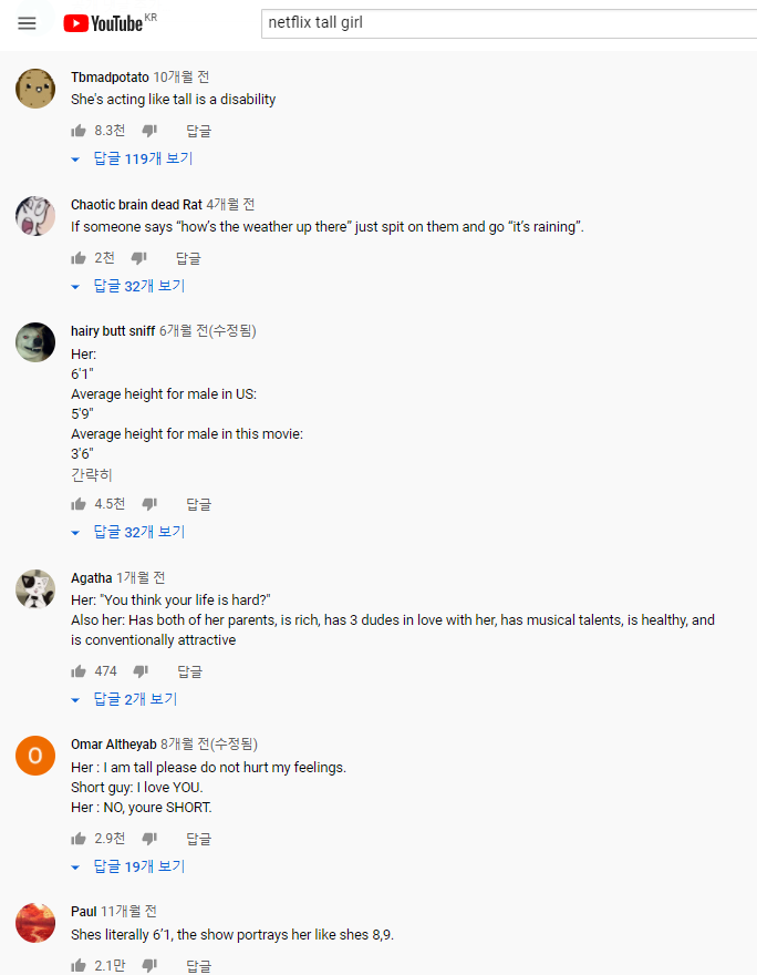 넷플릭스의 톨 걸(Tall Girl, 2019) 리뷰를 가져왔다.