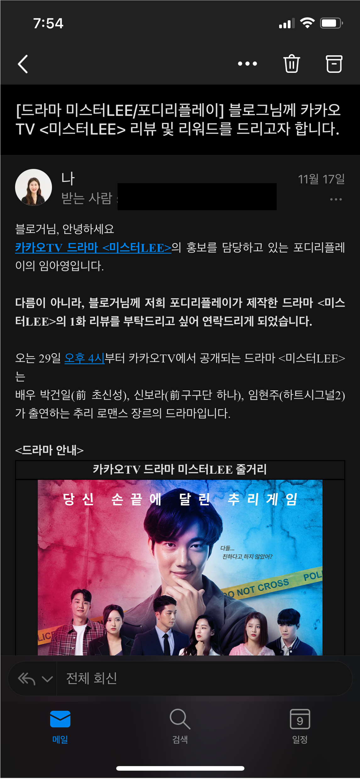 리뷰를 써줄 블로거(인플루언서) 섭외는 직접 한 명 한 명 블로그에 들어가서 우리 드라마를 긍정적으로 써줄 만한 분들을 선정했다. 그들이 평소 쓰는 엔터테인먼트, 드라마 리뷰의 결을 하나하나 보고, 우리 드라마를 잘 써줄 사람들을 대상으로 아래와 같은 메일을 한 명 한 명에게 보냈다. 총 80명에게 보냈고, 21명 섭외에 성공했다.