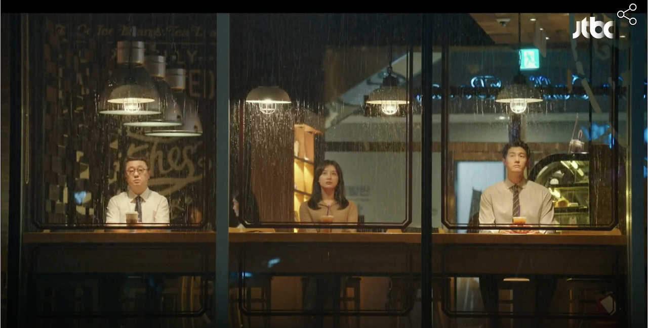 비가 억수같이 쏟아지는 날의 첫 모임. 마주 보고 앉는 것도 스트레스여서 창가에 일렬로 앉아 각자의 이야기를 하는 장면이었다.