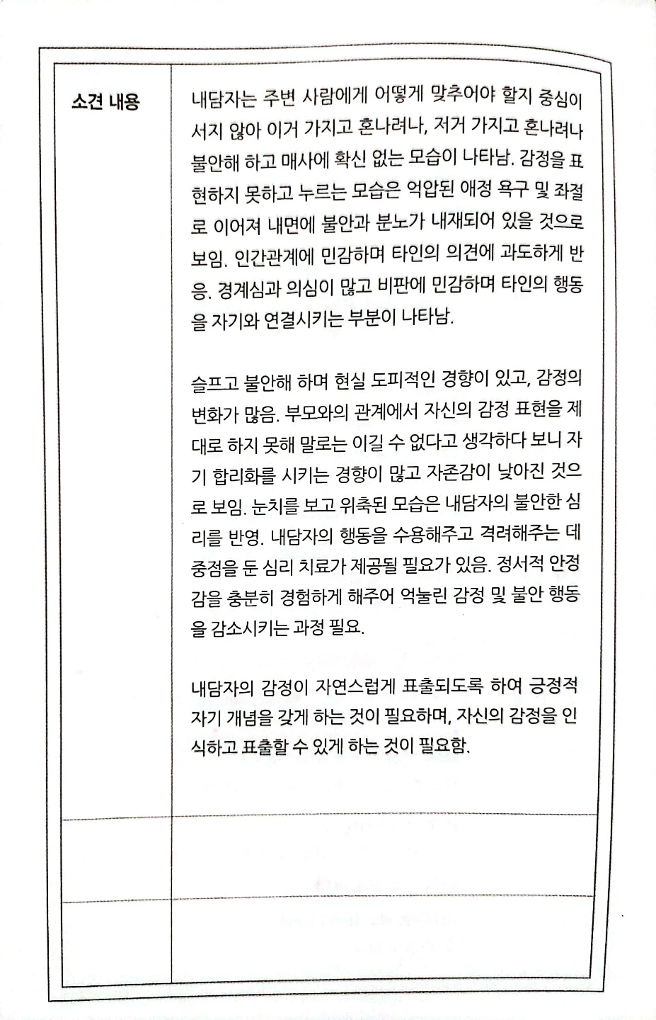 내담자는 주변 사람에게 어떻게 맞추어야 할지 중심이 서지 않아 이거 가지고 혼나려나, 저거 가지고 혼나려나 불안해하고 매사에 확신 없는 모습이 나타남. 감정을 표현하지 못하고 누르는 모습은 억압된 애정 욕구 및 좌절로 내면에 불안과 분노가 내재되어 있을 것으로 보임. 대인관계에 민감하며 타인의 의견에 과도하게 반응하며 경계심과 의심이 많고 비판에 과도하게 민감하고, 타인의 행동을 자기와 연결시키는 부분이 나타남.