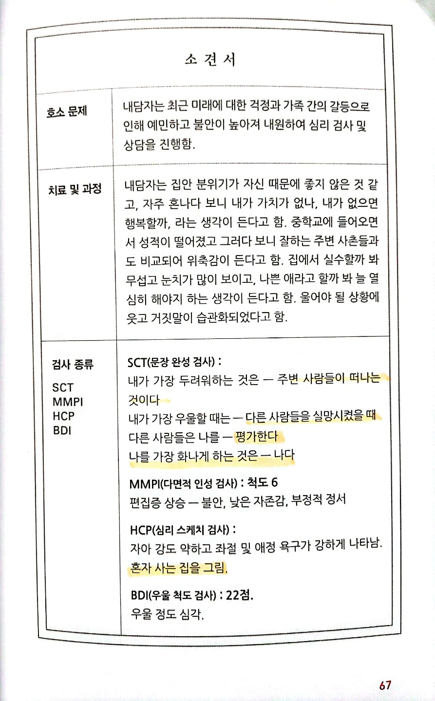 HCP(심리 스케치 검사) : 자아 강도 약하고 좌절 및 애정 욕구가 강하게 나타남. 혼자 사는 집을 그림.