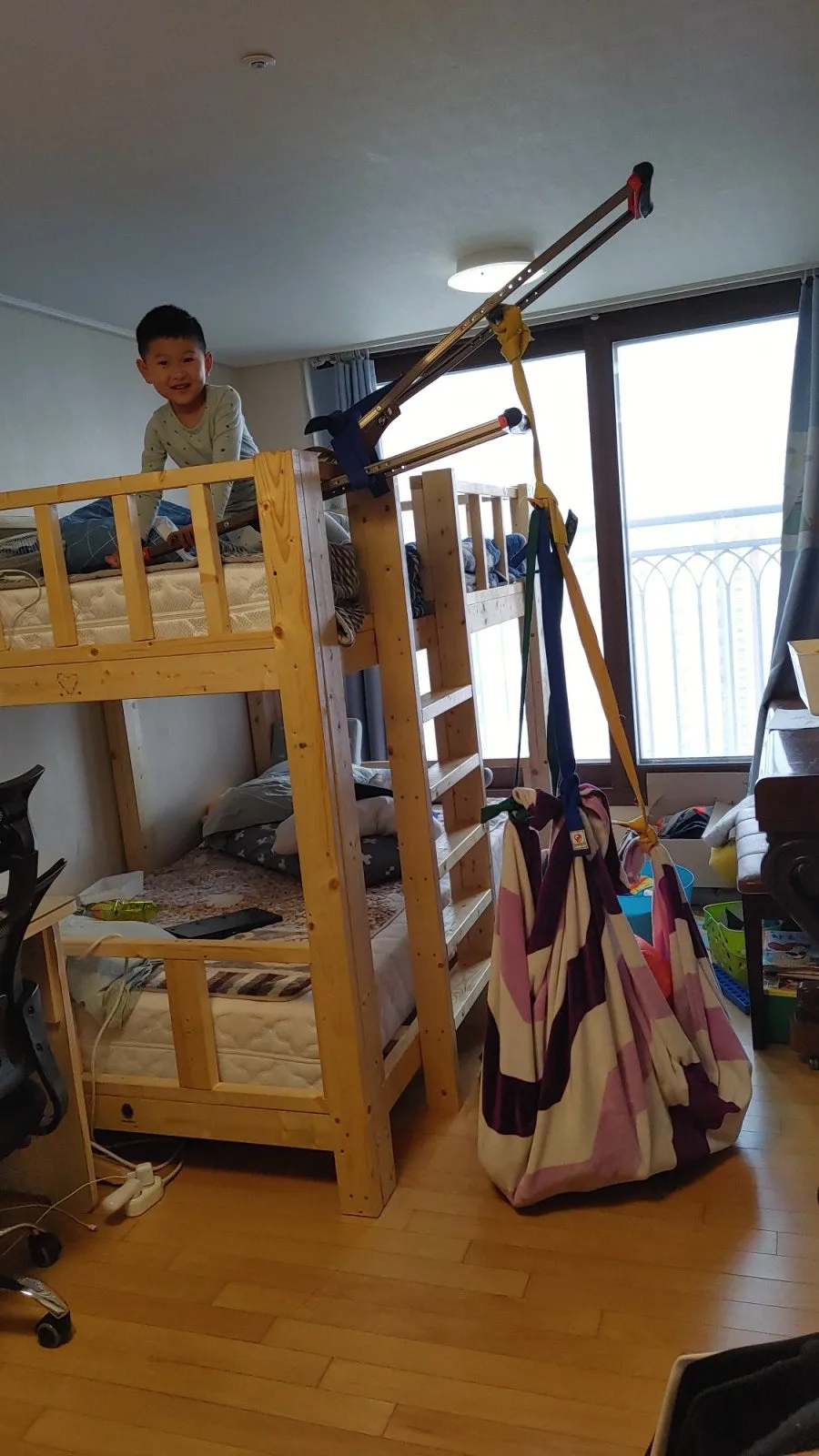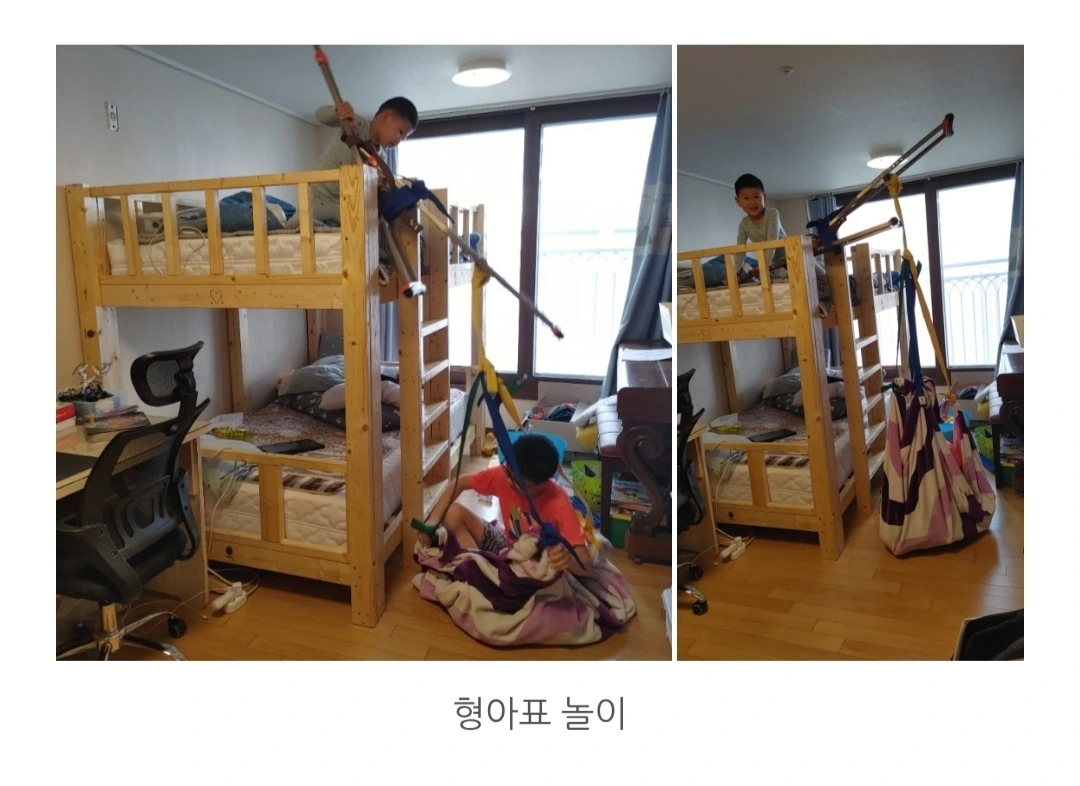 상상치 못한 광경에 2층부터 아래로 유심히 관찰했다. 2개의 목발이 태권도 끈으로 2층 침대에 묶여 있다. 6살 동생은 목발의 모서리를 잡고 아래 형을 내려다본다. 끈은 아래에 펼쳐진 담요의 모서리에 연결되어 있고 11살 형이 그 안에 앉아있다. 형이 “지금이야!” 하고 외치는 순간 막내는 진지한 얼굴로 목발을 아래로 눌러 내린다. 목발이 지렛대처럼 기울면서 끈을 잡아당기자 담요가 바구니 모양이 되었고, 형이 잡혔다.