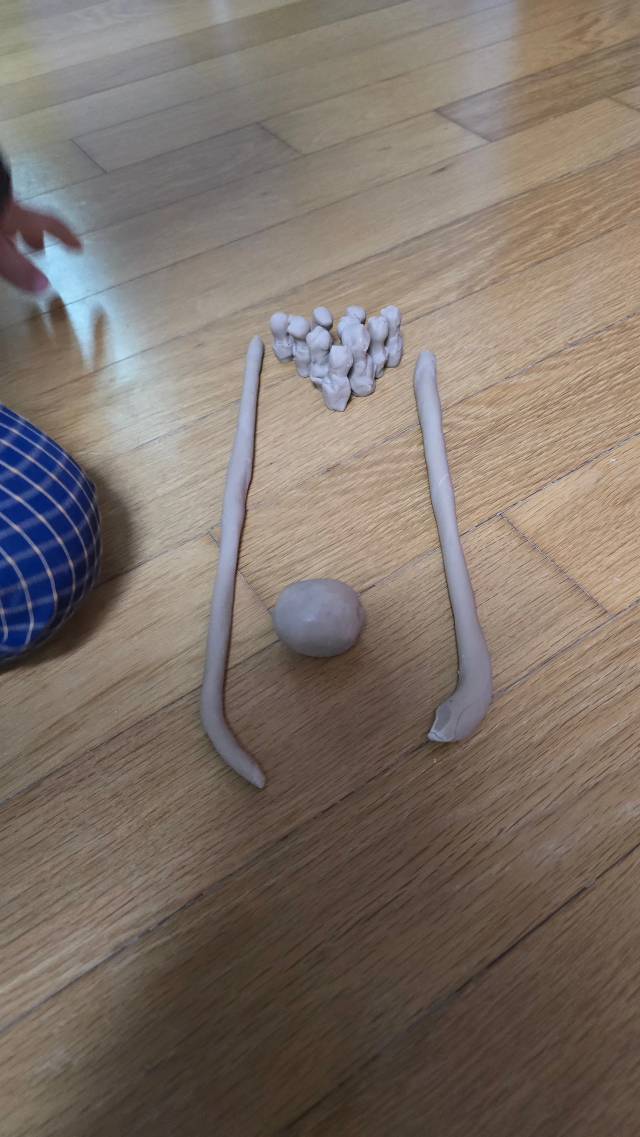 손으로 굴리는 대신, 찰흙으로 만든 대형 망치로 공을 '퍽' 치는 방식이다.