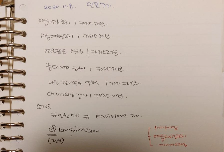 온라인에서 하고 싶던 일들을 적어보기 시작했다. 나는 마음 챙김, 나를 찾는 마음 여행, 춤 세러피 등에 관심이 있었고, 그런 글들을 쓰고 싶었다. 어느 한 가지를 확실하게 정한 게 아니었기 때문에 이름의 뜻을 넣기로 했다. 그래서 처음 정한 것이 < 선물 같은 사랑, 카리스러브입니다. >였다.