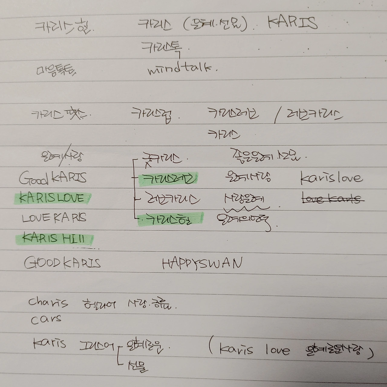 그리스어로 은혜로운, 선물이라는 의미가 있었고, 카리스마의 어원이라고 했다. 두 의미 다 마음에 들었다. "카리스" 입말도 딱 좋았다. 그런데 카리스만 하기에는 흔해 보였다. 의미가 있는 한 단어를 붙이고 싶었다. 그래서 하나씩 붙여 나열해 보았다.