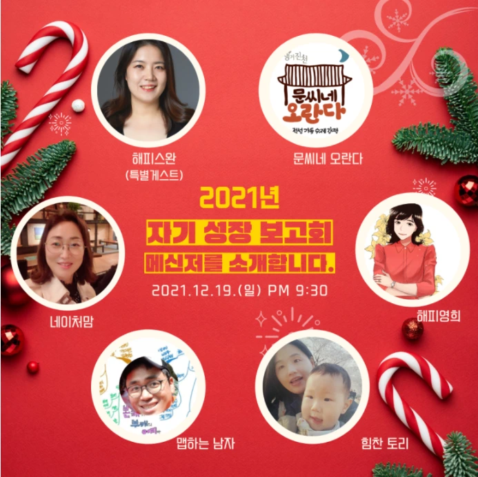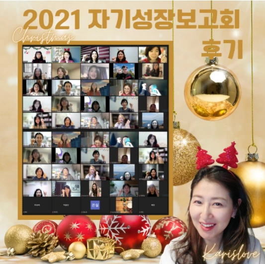 <자기 성장 계획서 함께 쓰기>는 월 말에 <자기 성장 보고서>를 써서 한 달의 마침표를 찍는다. 그리고 연말에 자기성장보고회 파티를 열었다. 나의 일관된 메시지는 <선물 같은 사랑, 카리스러브의 선물 같은 하루> 였기 때문에 정말 선물 같은 하루를 선물하고 싶었다. 더 감동적인 선물은 없을까 고민하고 고민했다. 온라인이지만 크리스마스 장식도 하고, 행운권 추첨도 만들어 선물도 푸짐하게 준비하고, 평소에 써보지 않던 빨간색 루돌프 머리띠도 썼다. 메신저들이 들려주는 일상의 감동적인 성장 보고는 '모두의 삶은 가치롭고 삶은 아름다운 선물'이라는 메시지를 가득 전해 주었다. 서로를 격려하고 '한 해를 잘 살았구나' 셀프 칭찬하며 마무리하는 시간이 되었다.