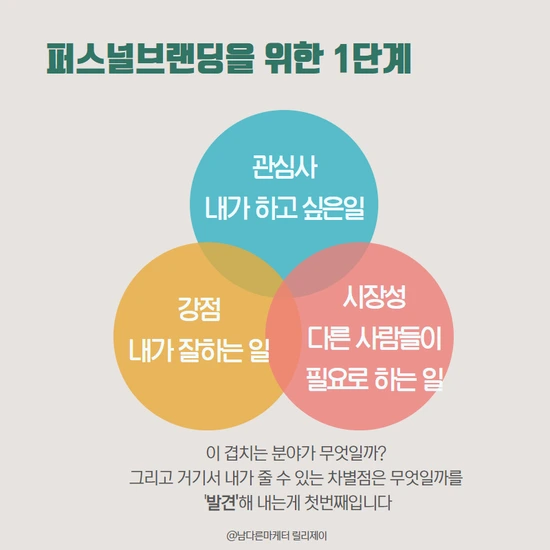 퍼스널 브랜딩 책을 보면 공통적인 그림을 볼 수 있다. 내용은 조금씩 다르지만 교집합을 그린다는 것. 나의 세상과 또 다른 세상이 만나는 영역. 그 영역에 나만의 콘텐츠가 숨어있다. 아래 사진들은 자신만의 콘텐츠를 찾기 위한 방법을 교집합으로 설명해 놓은 그림들이다. 하나씩 살펴보자.