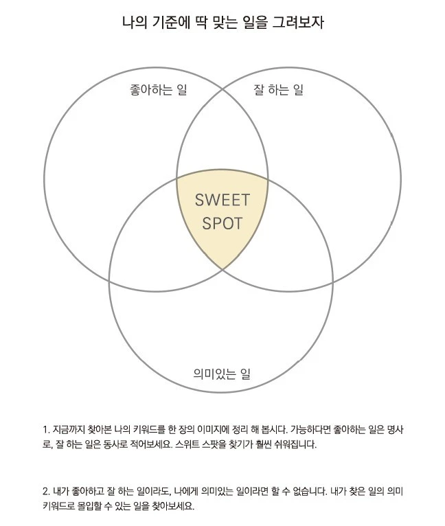 최대한 작은 단위로, 자세히, 많이 적을수록 유리하다. 다 적었다면 3개의 그림에 모두 속하는 일에 O를 해보자. 그 가운데 들어가는 일이 " SWEET SPOT"이다.