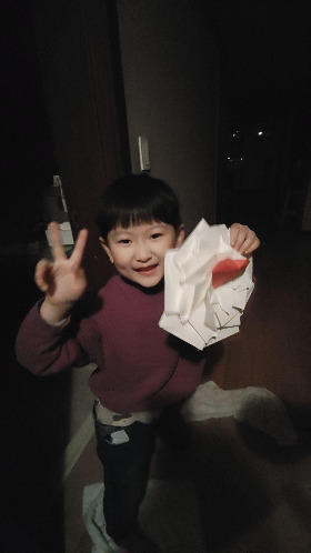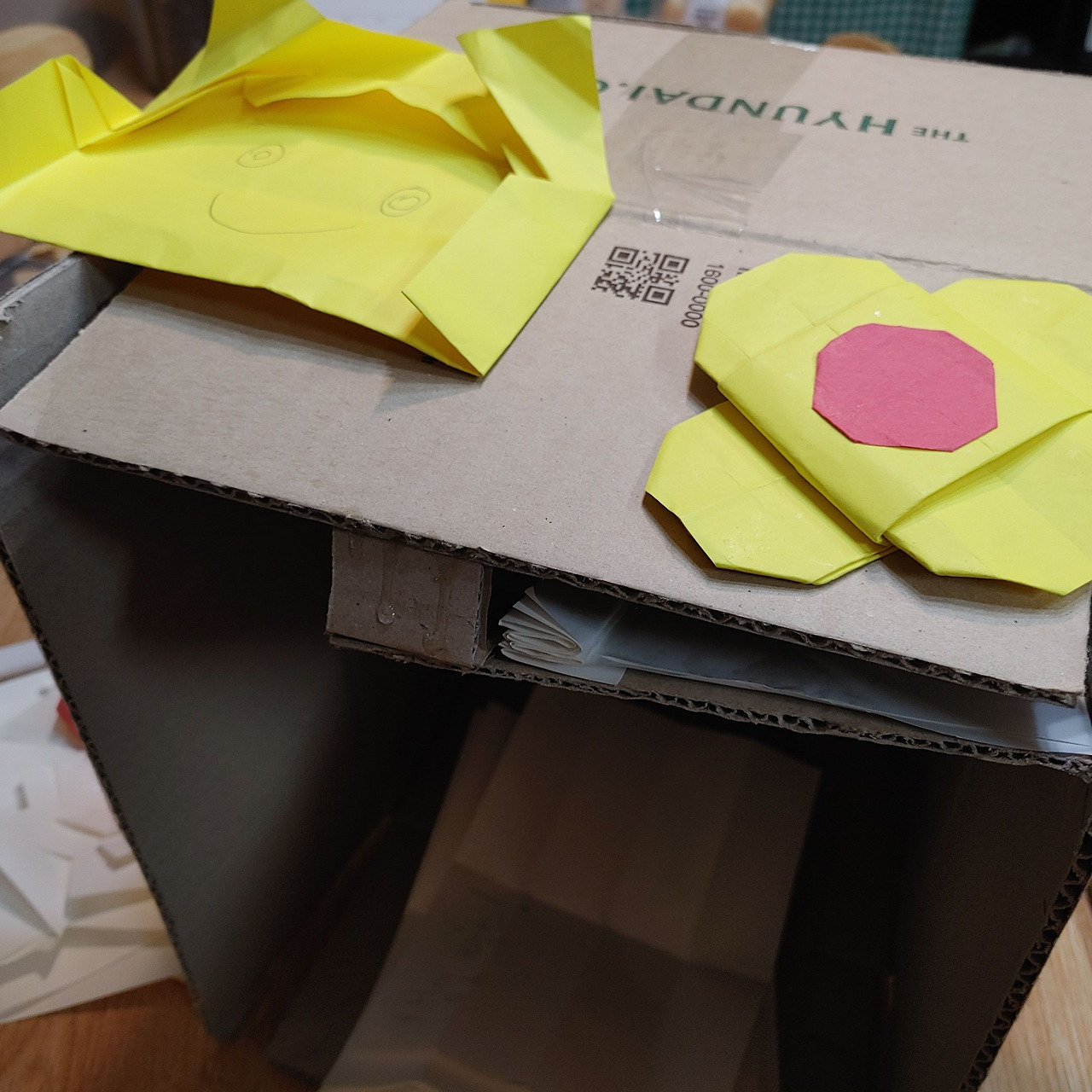 "엄마, 이건 진짜 비밀인데 엄마생일에 엄마에게 줄 생일선물박스를 만들고 있어. 그 안에 선물이 엄청 많은데 아직 더 만들어서 넣어야해요. 뭐가 있는지는 비밀이야."