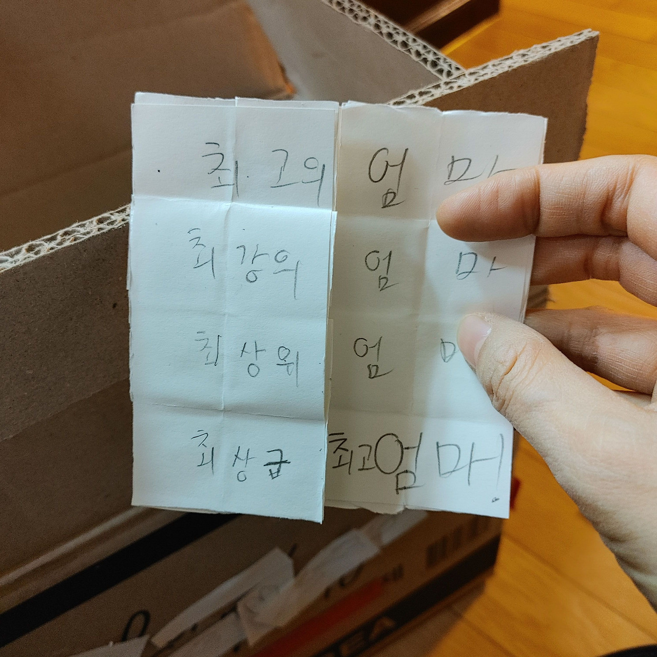 접힌 쿠폰을 하나하나 열어볼 때 마다 내용을 열심히 설명하느라 바빴다. 미리 준비해둔 리액션을 해가며 쿠폰을 천천히 열었다. 너무 행복하다고, 언제 이렇게 커서 엄마에게 이런 걸 만들어 주냐고, 너희를 낳기를 정말 잘했다고, 세상에 이런 아들들은 없을 거라고 엄지척을 해주었다. 무엇을 준비하고 있는지 아는데도 실제로 보니 꼬불꼬불 써진 글씨가 마음을 막 후비고 들어왔다. 벅차다는 말로는 부족했다.