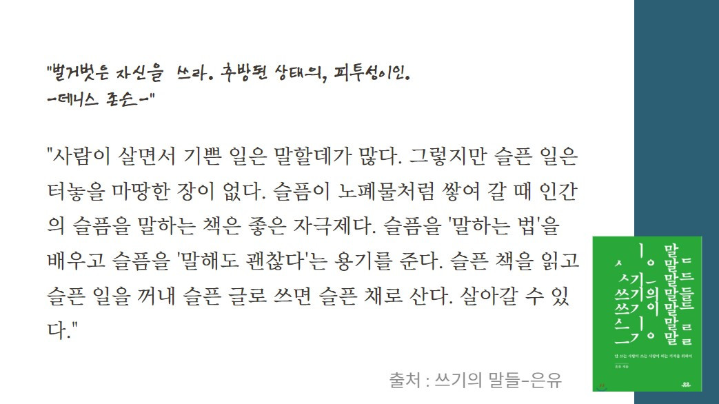 맞았다. 결코 없었다. 아무 생각 없이 글자를 따라가던 내가 생각을 하고, 질문을 하고, 그 이야기를 살았다. 걱정을 잊고 다음 시간을 살 수 있었다. 책은 슬픔을 '말하는 법'을 가르쳐주고 슬픔을 '말해도 괜찮다'고 용기를 주었다.(쓰기의 말들-은유)