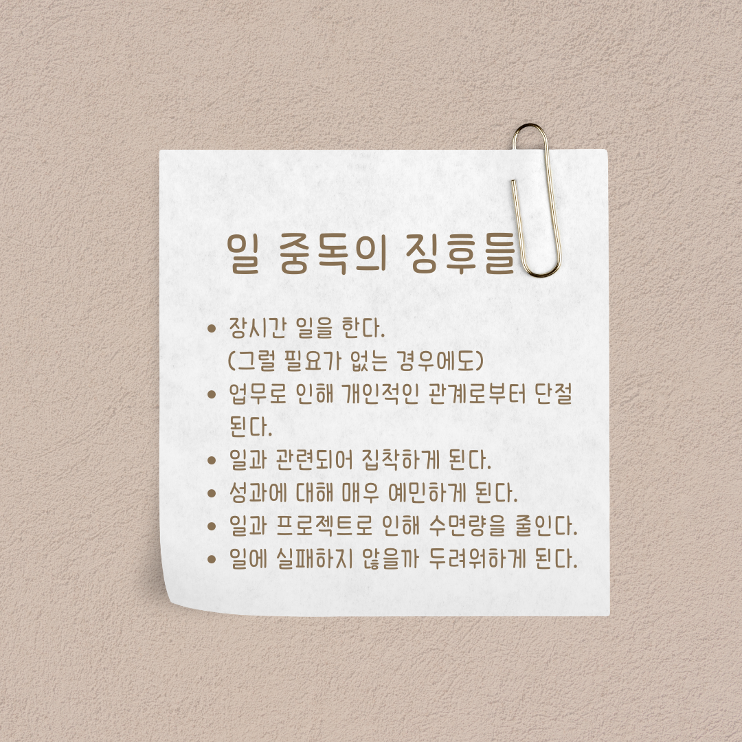 과잉 적응 증후군이라고도 하는 일중독의 징후들이다. 일 중독에 빠져있을 때는 몰랐는데 나는 지독한 일 중독자였다.