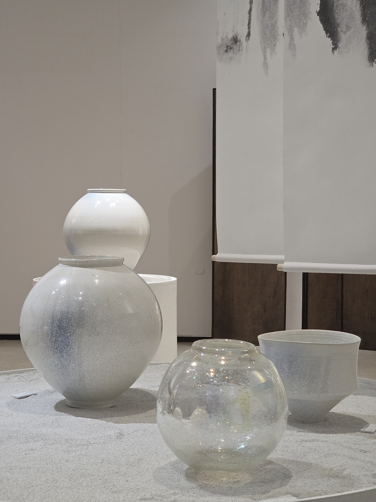 이번 호캉스의 마지막은 달항아리 전시였다. 나는 아직 그 매력에 흠뻑 빠지지 못했는데 와이프가 유독 달항아리를 좋아한다. 이 전시는 빛의 시어터가 있는 그랜드 워커힐이 아니라 비스타 워커힐 건물에서 진행되고 있었다. 서촌에 본점을 두고 있는 '일상여백'이라는 공예 편집샵에서 팝업전시회 형태로 전시회를 오픈한 것이었다. 가운데가 유독 볼록한 백자는 한 번에 만들기 어려워서 절반씩 만들고 이어 붙이는 작업을 통해 하나의 백자가 완성된다고 한다. 백자는 그 색이 고와서 어디에 사용할까 싶었는데 찾아보니 명확한 용도에 대한 기록이 없다고 한다. 추측상으로는 액체를 담아두는 용도가 가장 유력하다고는 한다. 또 하나 재밌는 사실은 백자의 입구 부분을 '아가리'라고 칭한다고 한다. 우리는 흔히 아가리가 입을 속되게 부르는 것으로 생각했는데 백자에 대한 설명에 그 단어가 있어서 흠칫했다.