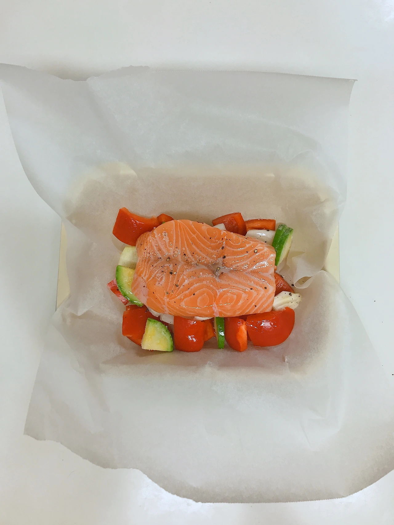 3. 야채 위에 연어를 얹는다. 연어에도 소금, 후추, 올리브유를 뿌리고 문질러준다. 마지막으로 화이트와인(또는 소주)을 생선 위에 뿌려준다.