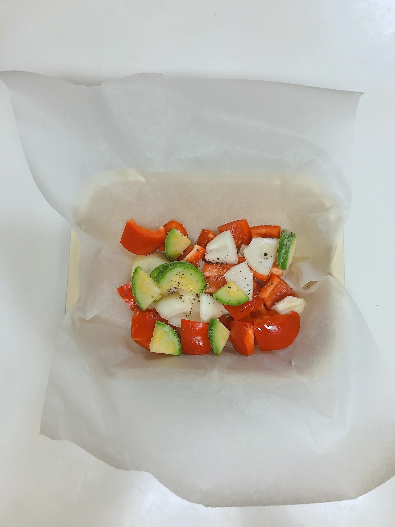 2. 종이호일 가운데에 한입크기로 썬 야채를 평평하게 깔고 소금, 후추, 올리브오일을 골고루 뿌린다.