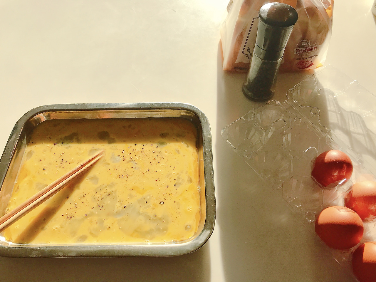 1. 넓은 그릇에 달걀 3개를 풀고 후추를 조금 뿌린다.
