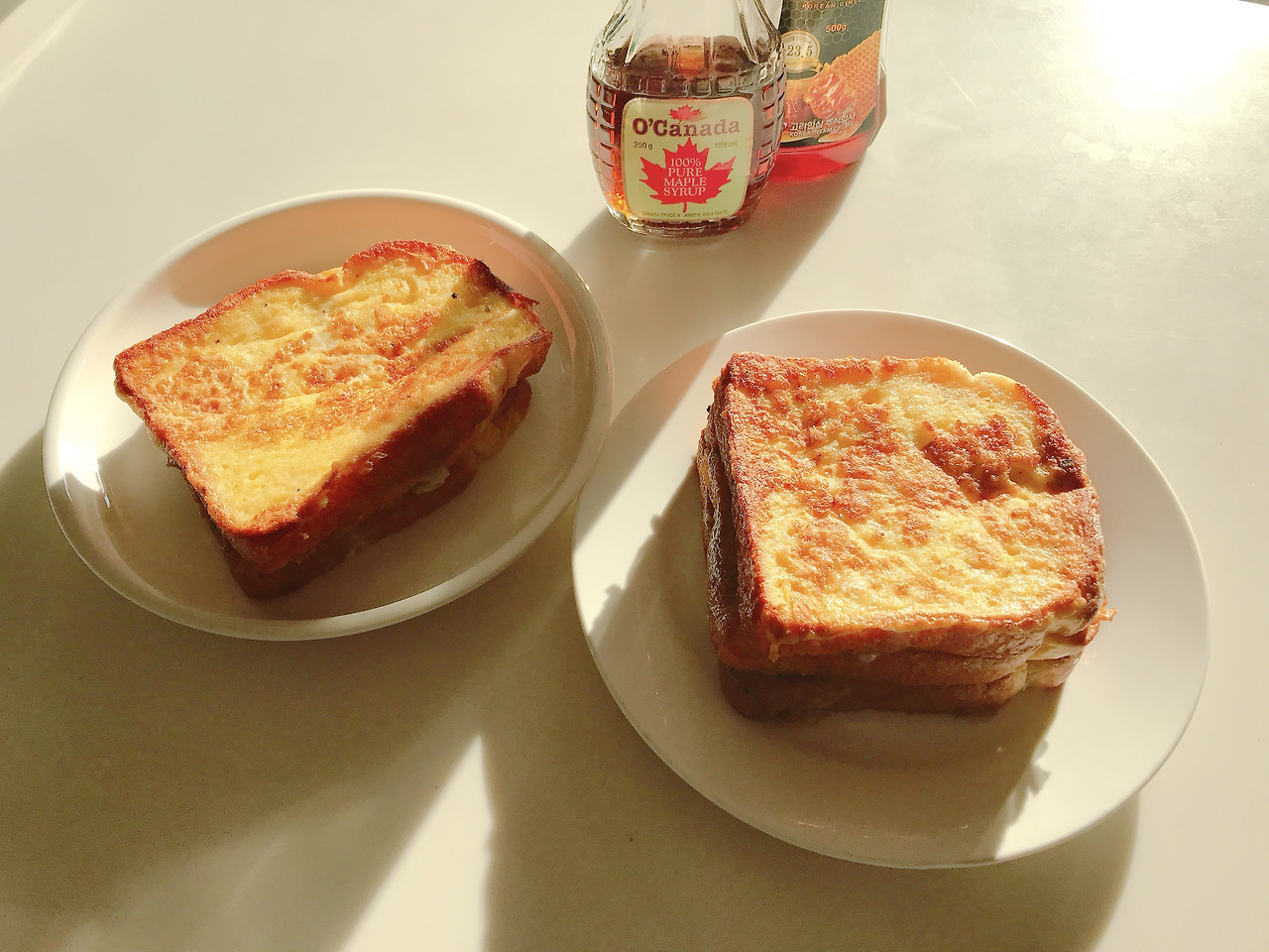 다 된 프렌치토스트를 접시에 담아 메이플시럽이나 꿀을 뿌려서 먹는다. 개인적으로는 메이플시럽을 좋아하지만, 동생은 메이플시럽이 조금 싱겁다고 느끼는지, 꿀을 더 좋아한다. 창밖을 보며 맛있게 먹는다. 커피 한잔과 먹으면 큰 수고도 하지 않으면서 브런치 분위기도 나는 든든한 토요일 오전의 식사가 될 것이다.