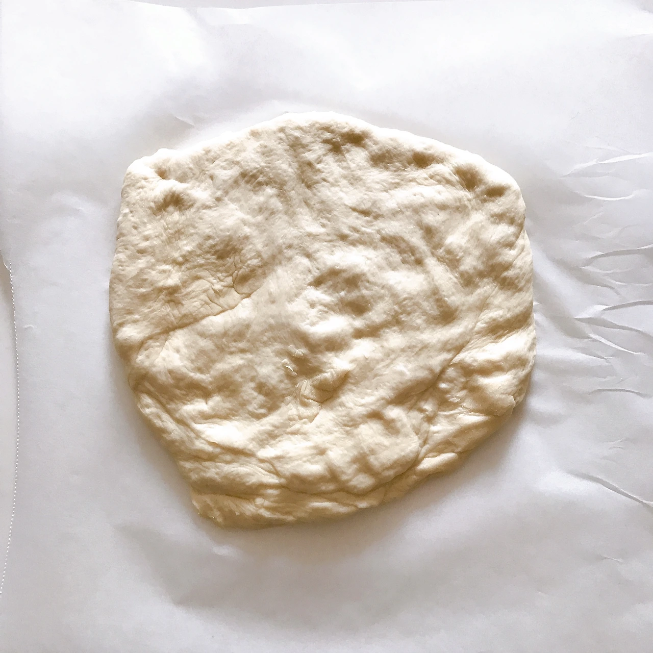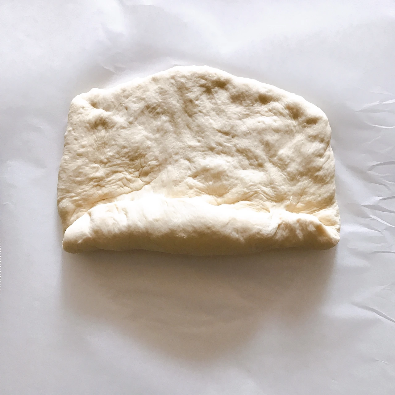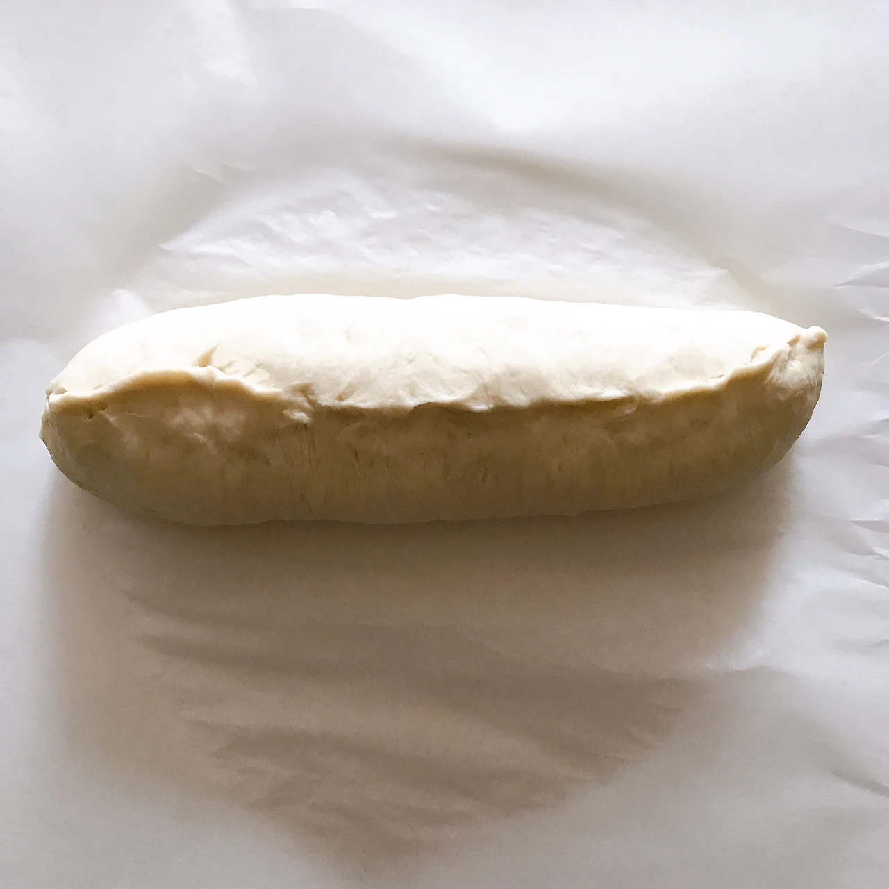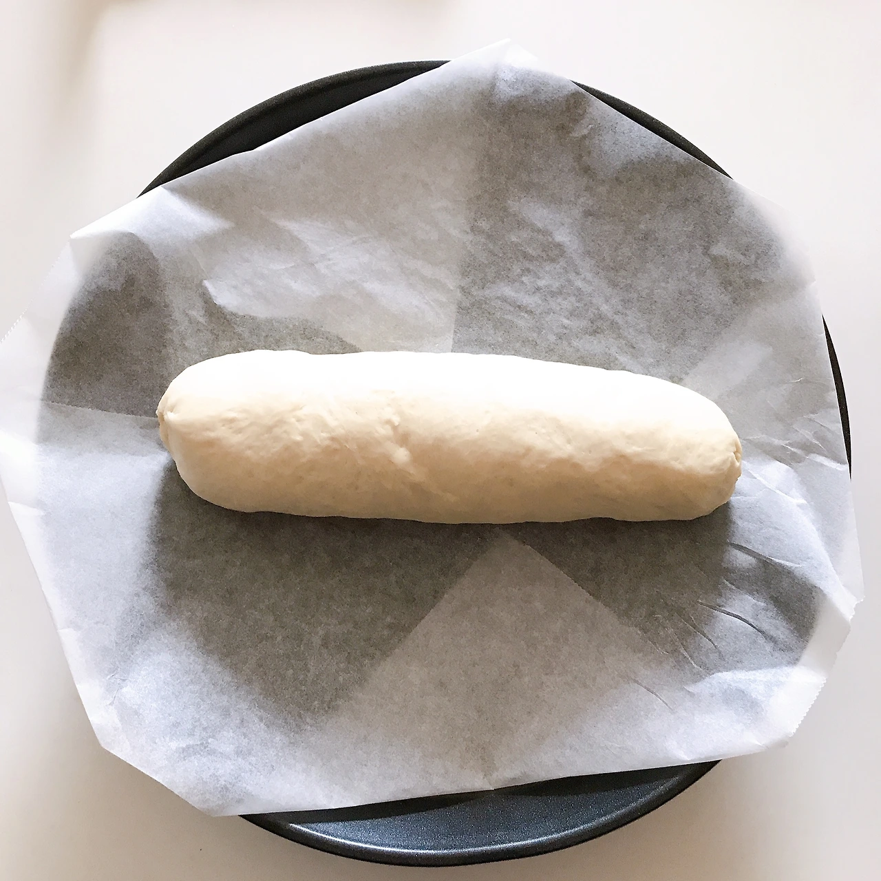 2. 반죽을 꺼내고 종이호일을 깐 평평한 공간에서 밀대나 손으로 반죽을 평평하게 편다. 민 반죽을 손으로 돌돌 말고 마지막 부분을 손가락으로 꼬집어 여며준다.