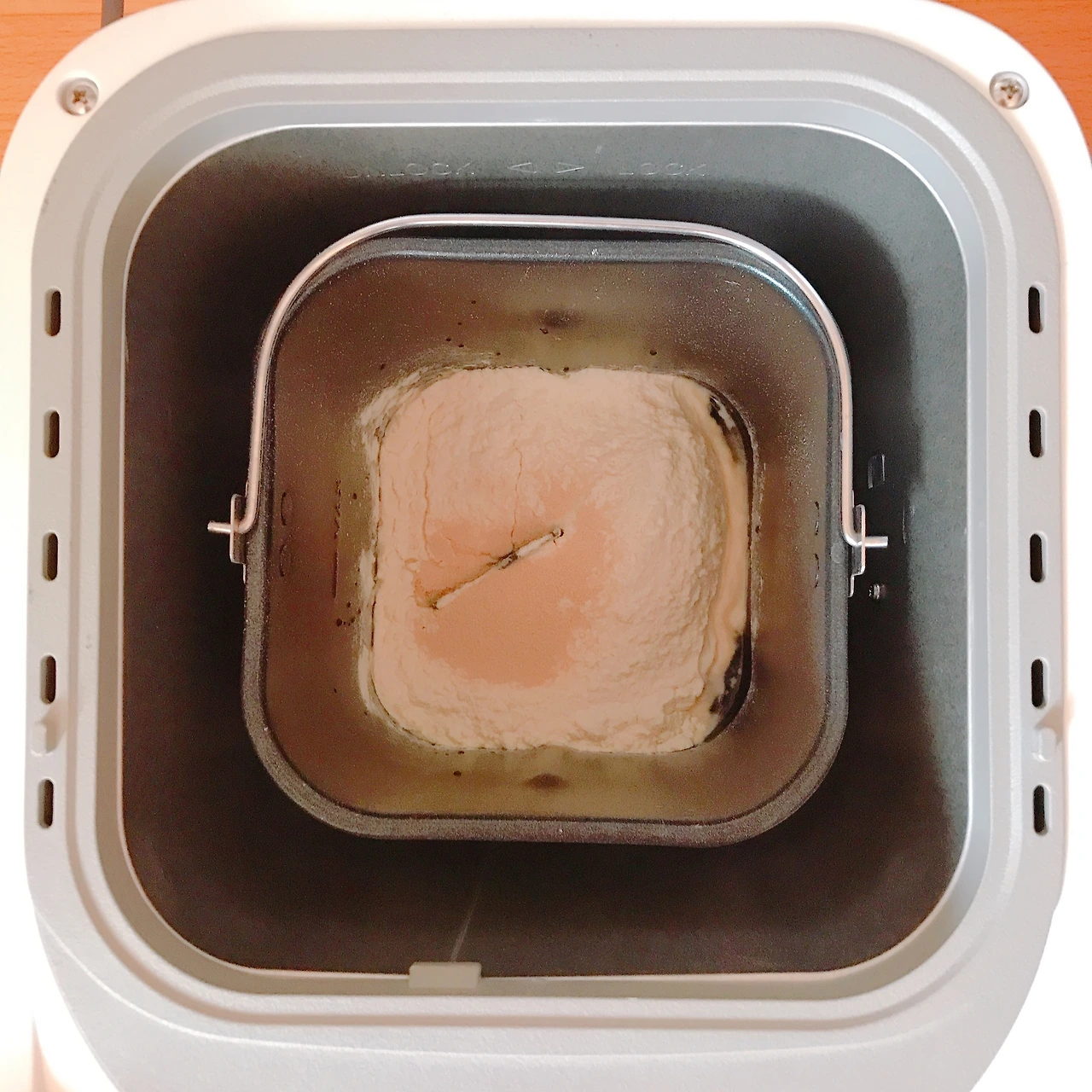 1. 소금과 꿀-물-강력분-이스트 순으로 제빵기에 넣고 반죽과 1차 발효까지 마친다. (이스트가 처음부터 설탕이나 꿀 등 당류와 접촉하면 안 되기 때문에 제빵기에 재료를 넣을 때 순서에 유의한다.)
