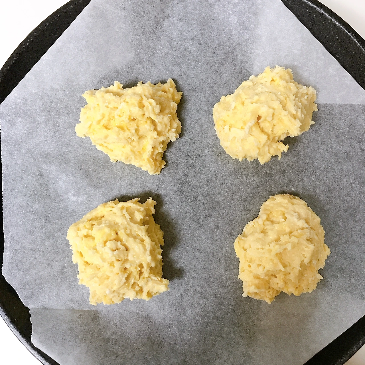 4. 오븐 팬에 종이호일을 깔고 3의 반죽을 1/4씩 뚝뚝 떼어 올린다. 모양 잡으려고 크게 신경안 써도 된다.