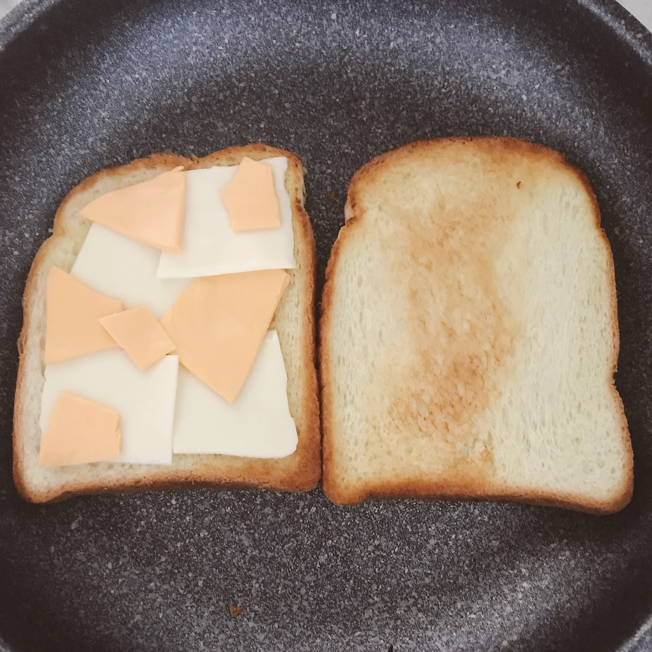2. 빵 한쪽에 슬라이스 치즈 한 장 반을 얹고, 나머지 빵 한 장을 덮는다. (이때 시간이 많이 소요돼서 빵이 탈 것 같으면 불을 잠시 끄고 치즈를 얹어도 된다.)
