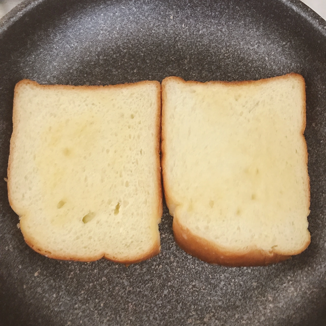 1. 후라이팬에 버터 한 숟가락 정도를 녹이고 식빵 두장을 앞뒤로 살짝 굽는다. (빵이 따뜻해질 정도로만 굽는다.)