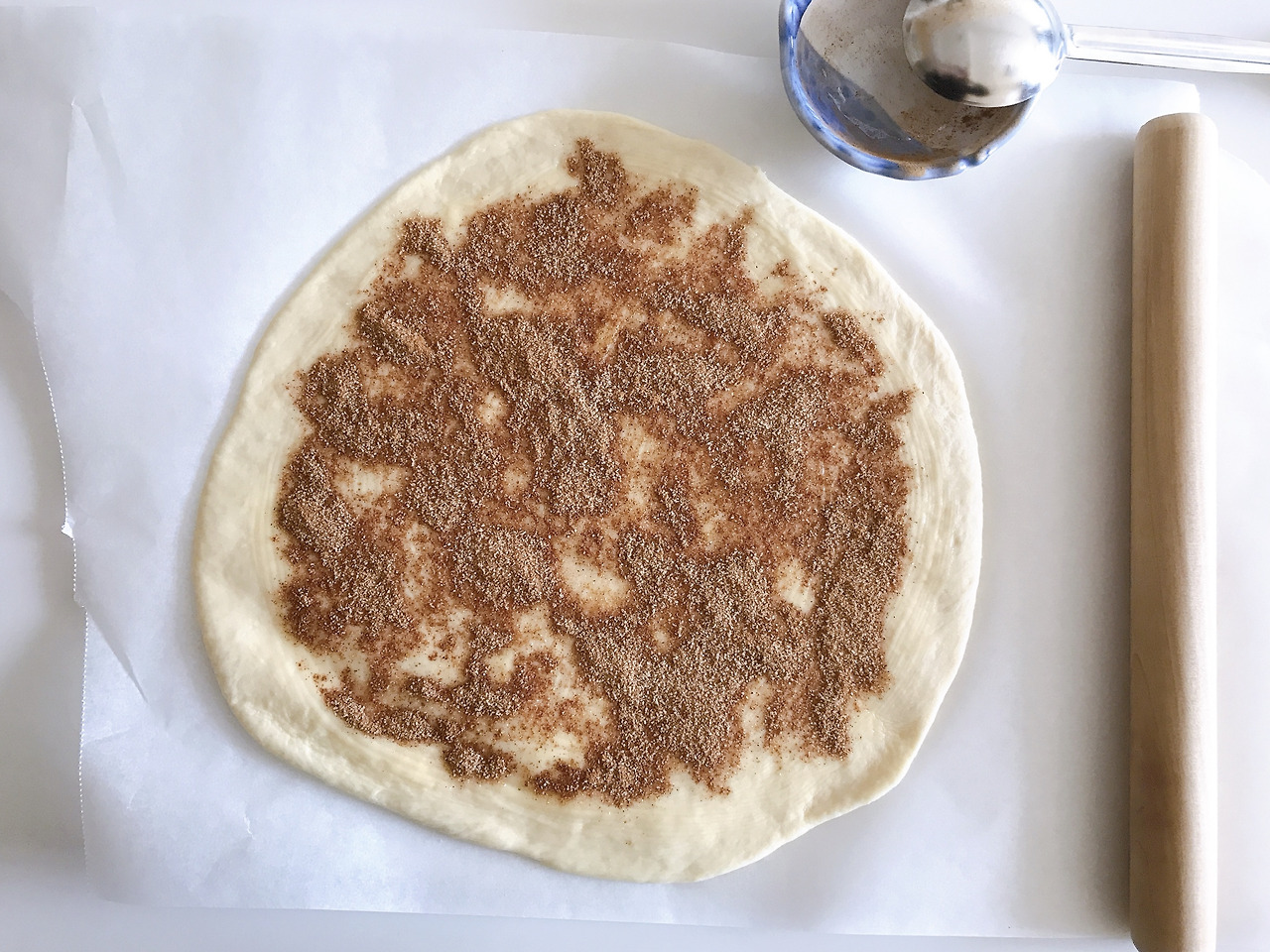 3. 버터를 바른 반죽 위에 황설탕과 시나몬가루 섞은 것을 골고루 뿌려준다.